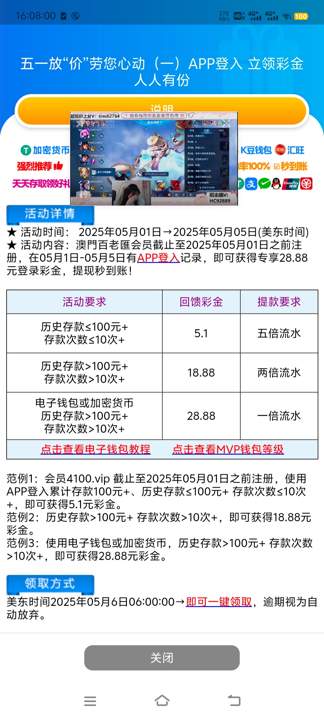 4100.net,5.1-5.5使用APP登录一次,美东时间5月6号6点(北京时间5月7号下午6点)领取app登录彩金要历史充值过,有就有,没有也不要中出我
