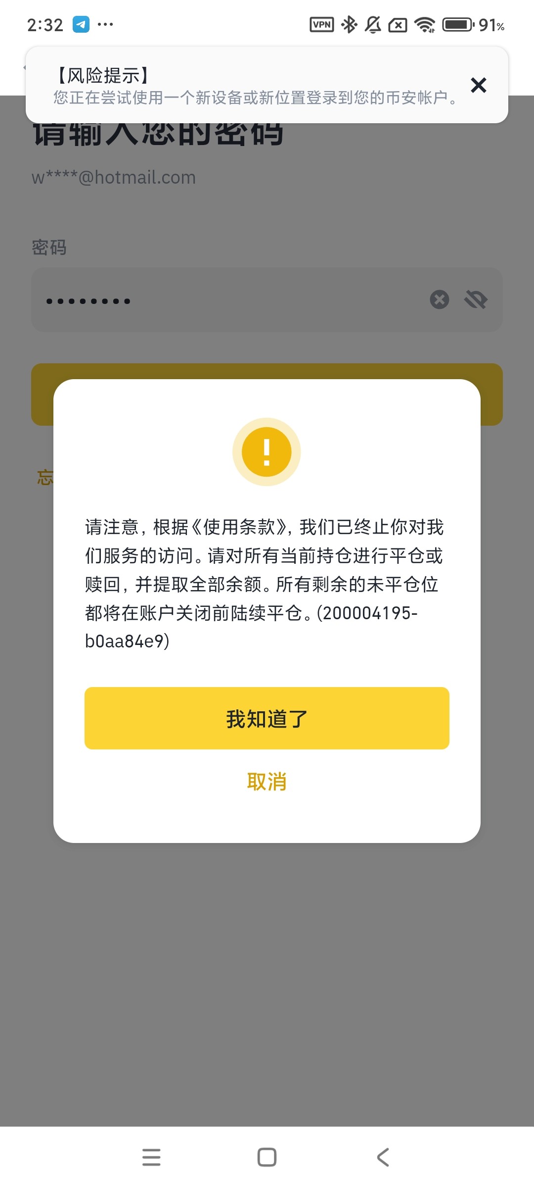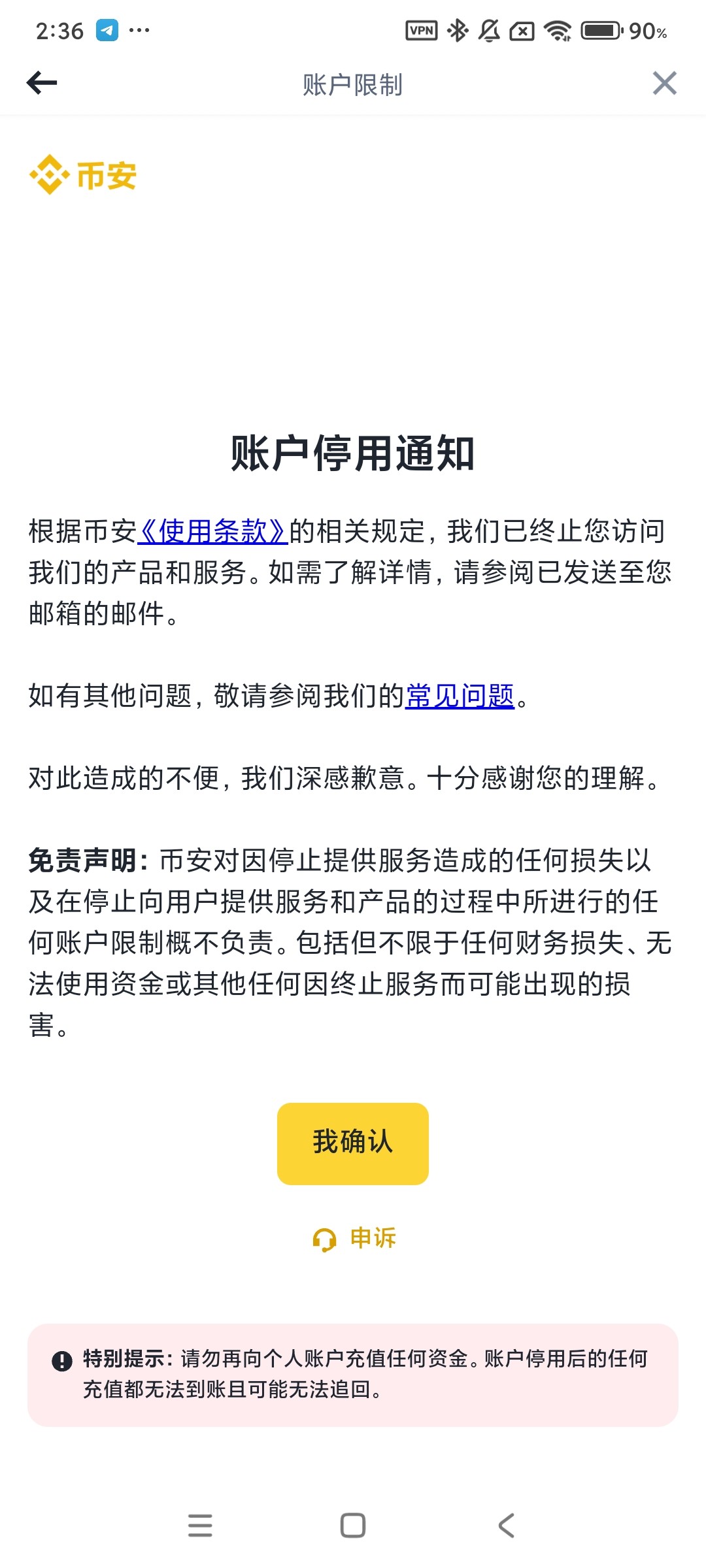 有没有大哥知道我的币安是被清退了还是违规了什么有没有法子解封,因为我注册了币安就没用过一直用的欧易,现在感觉想用币安登录上去就显示这样了。