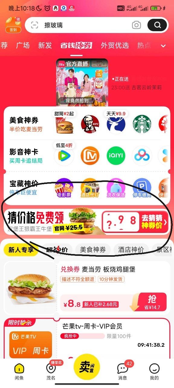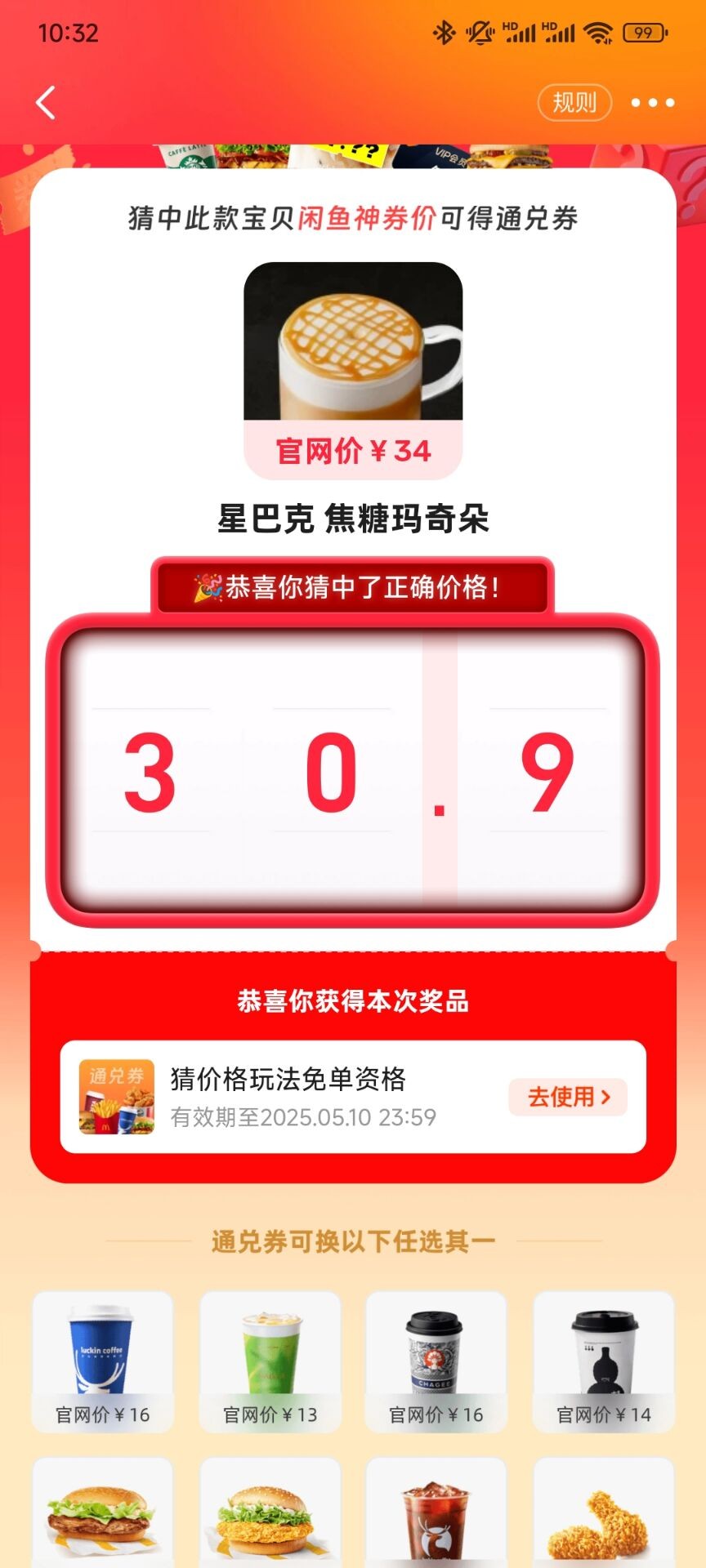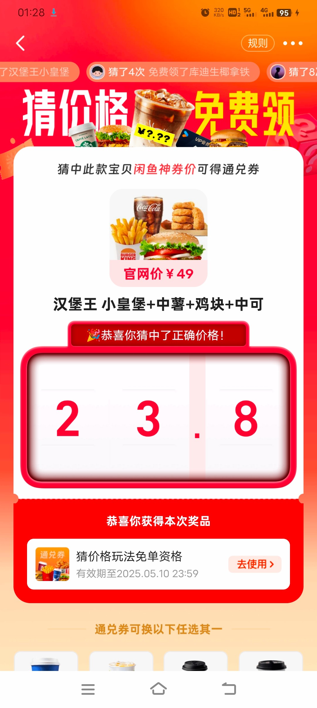 闲鱼主页-省钱神卷,进去5次猜的机会,我把麦当劳肯德基星巴克等等,那些价格全部打在评论区,你们抽中了了那个商品,就去猜就好了,我评论区发的是大概的价格,越猜后面的范围就越小,蒙一下容易猜中,觉得麻烦无视就好了,挂逼的