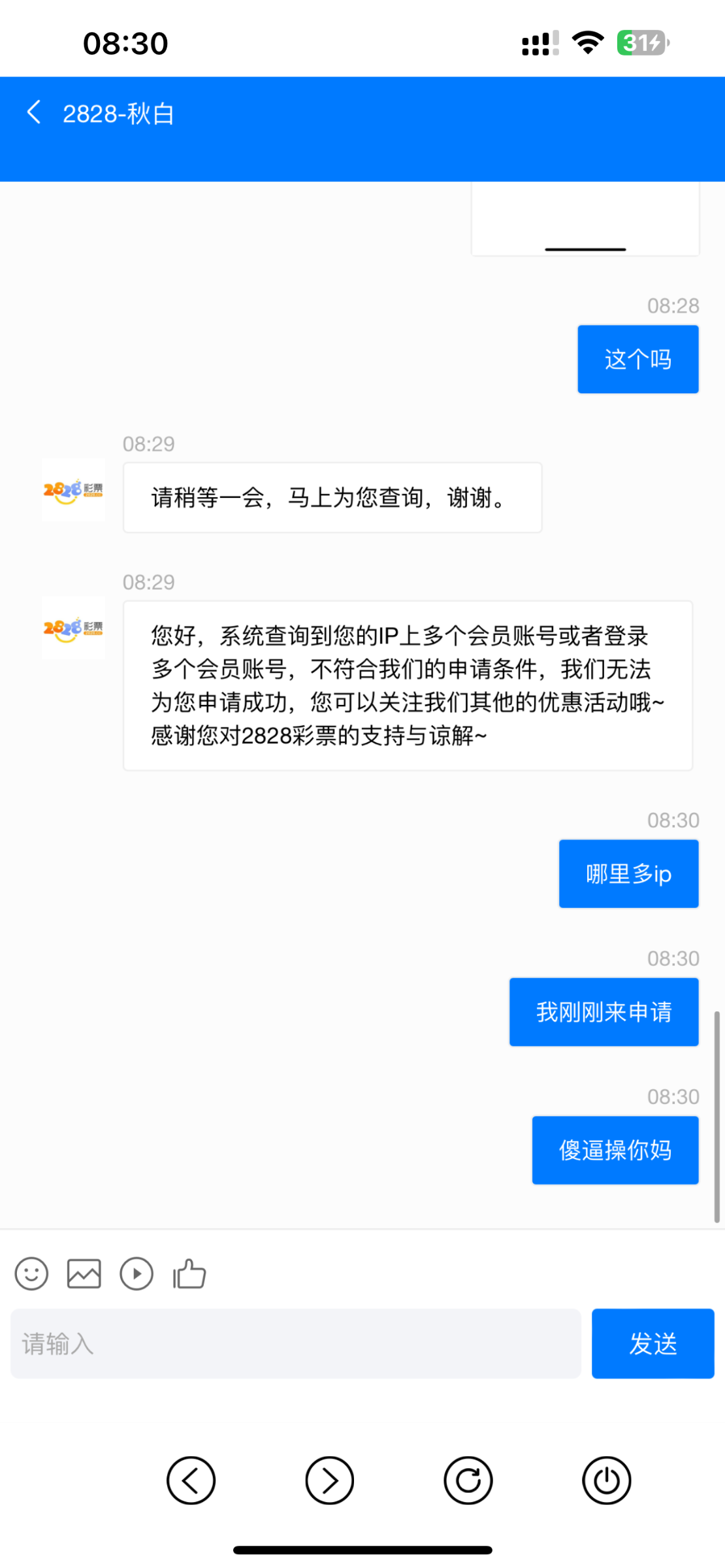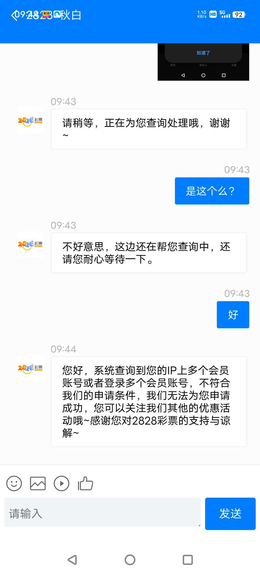 您好,不好意思,由于系统检测您的IP被注册多个账号,并且已领取该彩金,目前审核无法通过,建议您参加本站的其他活动哦,感谢您对2828彩票的支持与谅解!