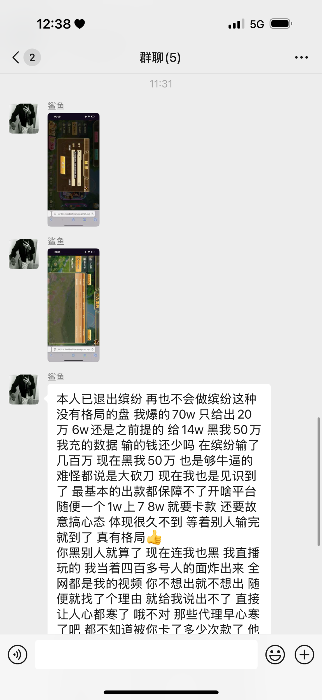 各位老哥能不玩就不玩吧玩也是小玩一下,我前天看缤纷台一个代理直播炸了六十万他很自信的说平台会给他出结果出了十几万黑了