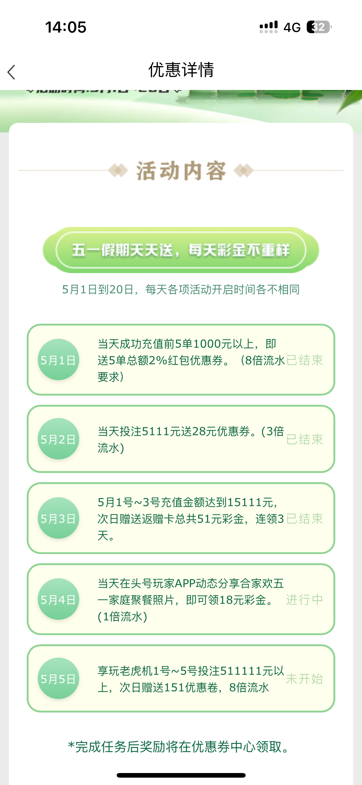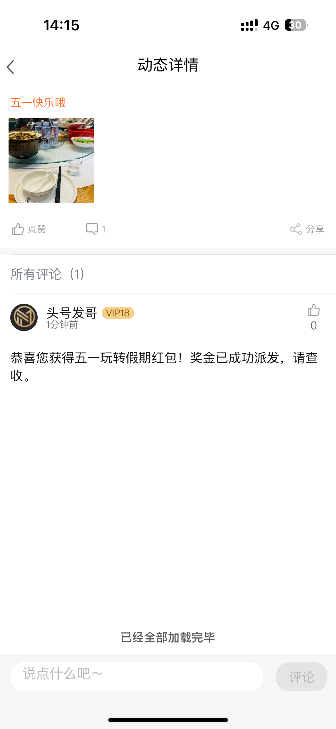 自己玩几年的台子,去app评论动态即可领取18红包。当天在头号玩家APP动态分享合家欢五一家庭聚餐照片,即可领18元彩金。(1倍流水)地址 th1688.co