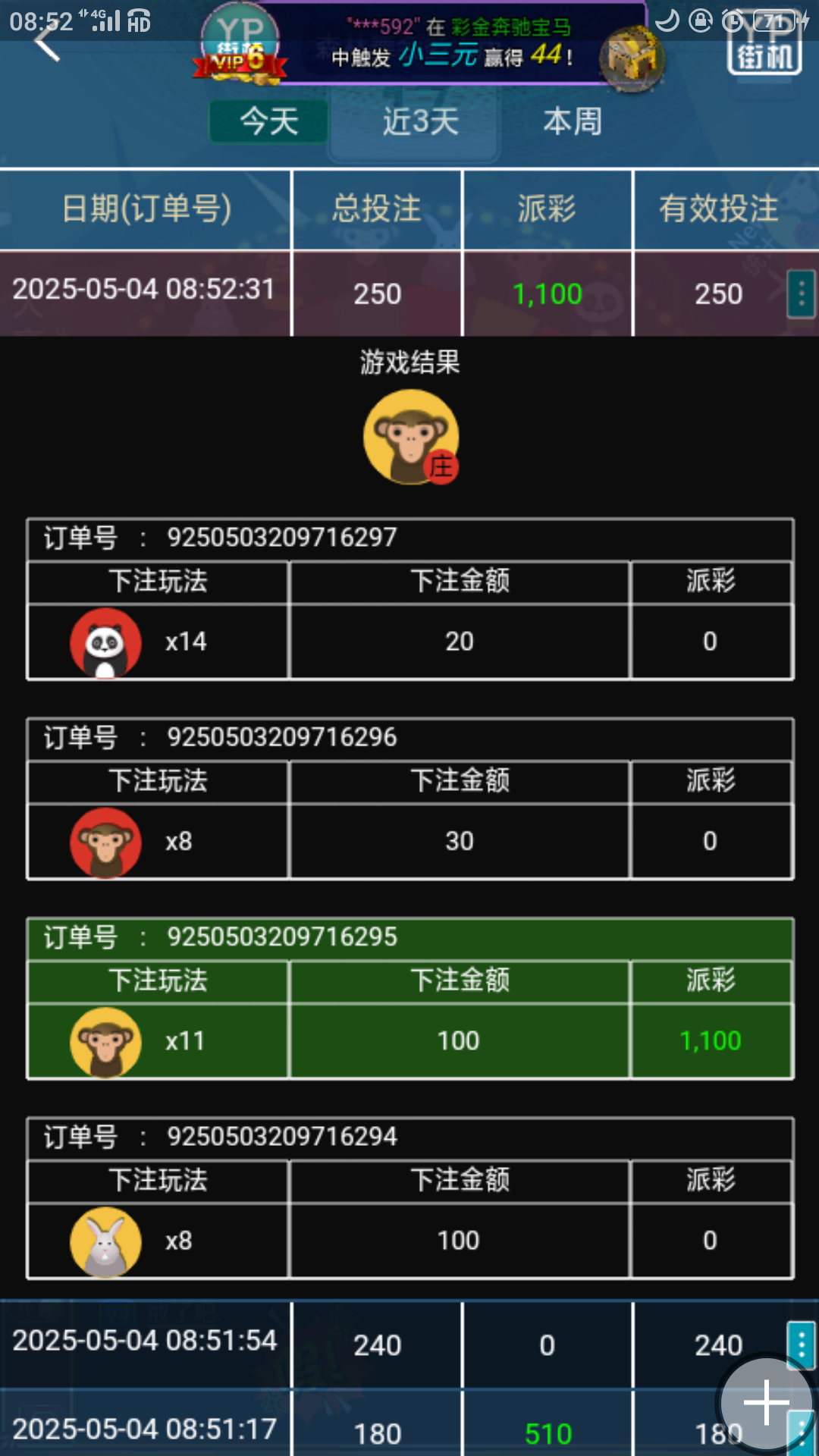 饭都吃不下了,难受,中了6块40倍黄狮,后面又中100猴子,12块打到5400,又一分没留送回去。精彩网系列是真的有毒,多人版像单机一样假,几千块都被盯着杀。