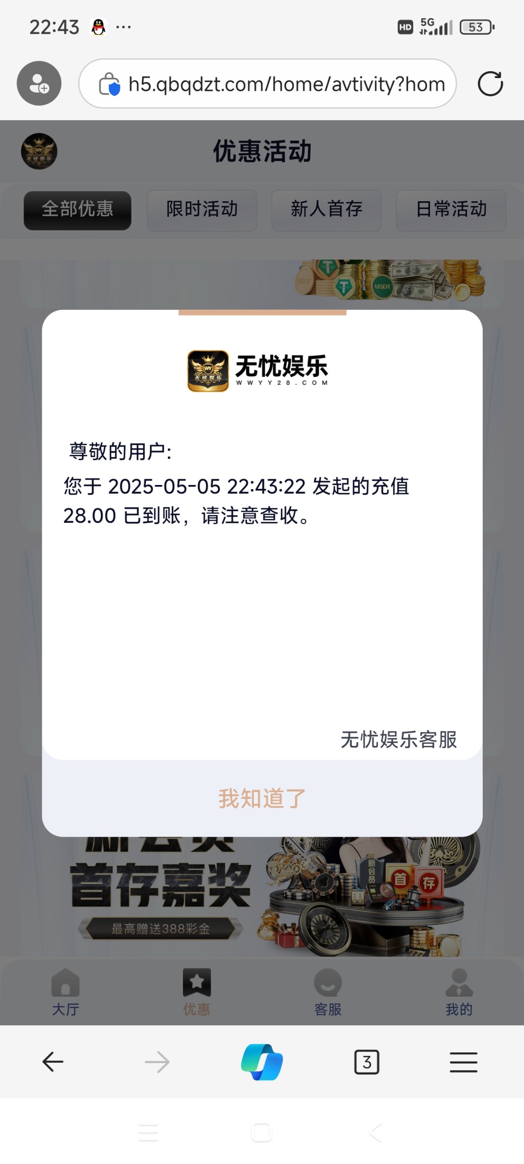 20没打出来,反水5块打到了400多,客服说只能提现228唉