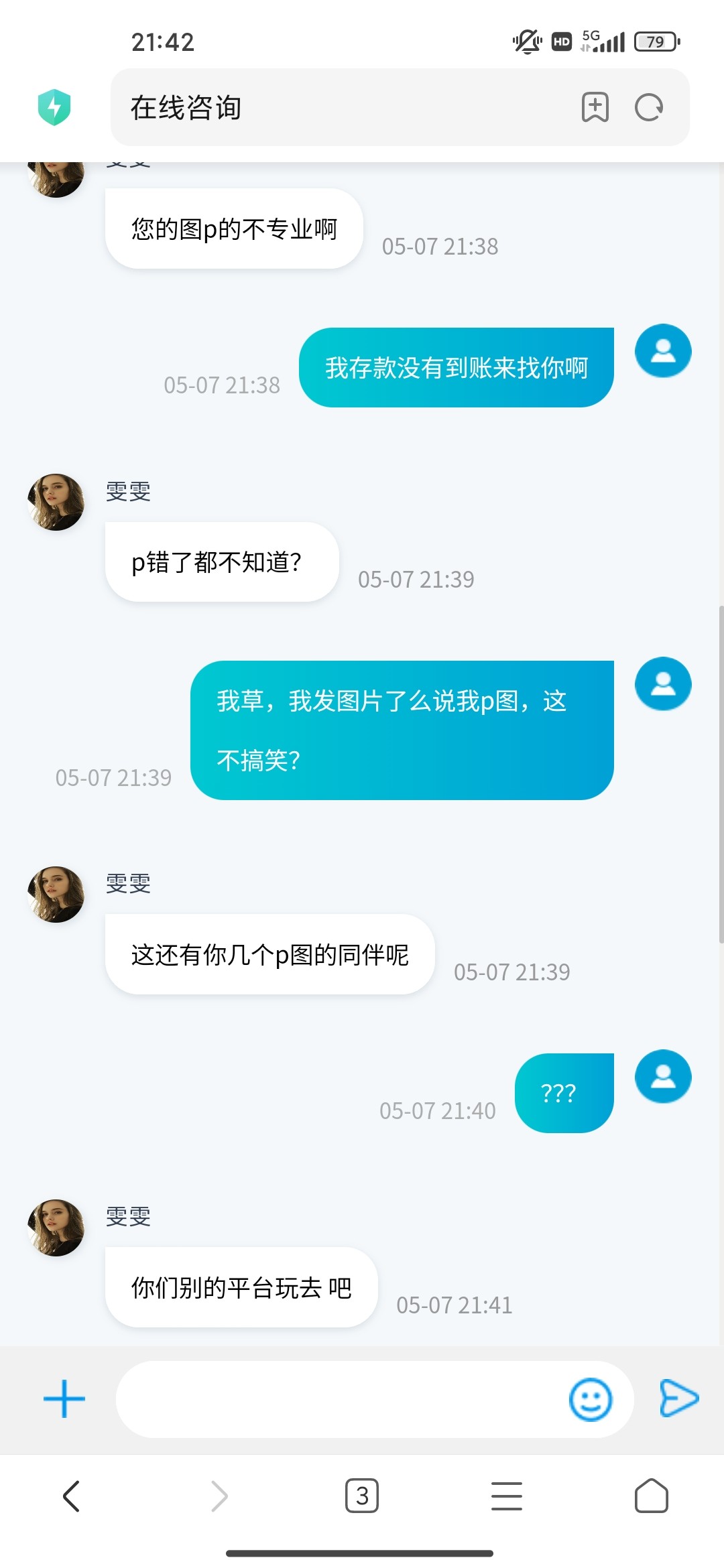 妈的,被你们p爆了,发短信我以为新平台,卡密存了100没到去找客服,还没提供交易凭证,直接账号拉黑,说全是一伙p图的