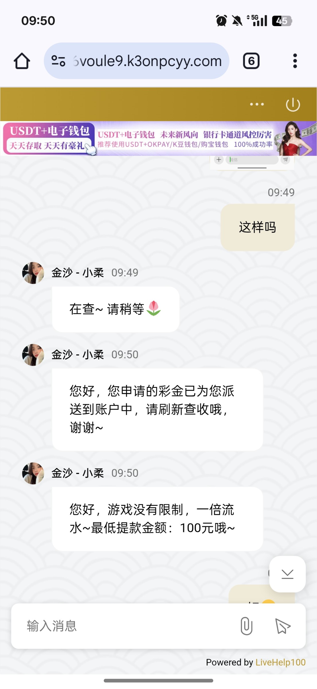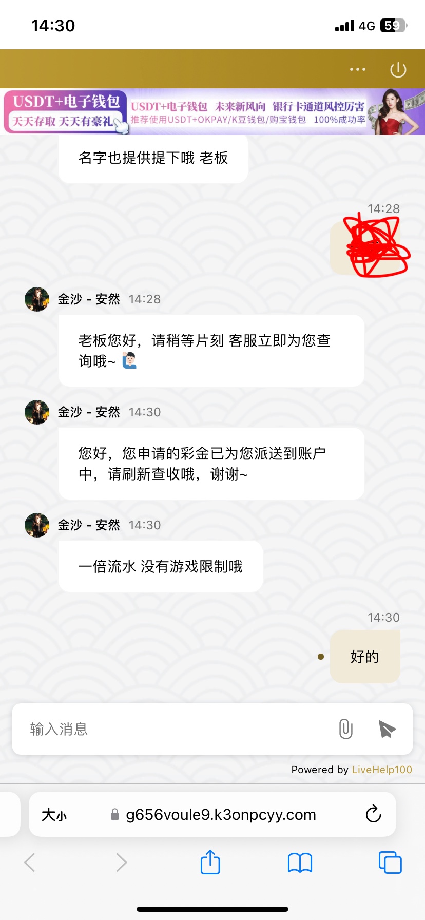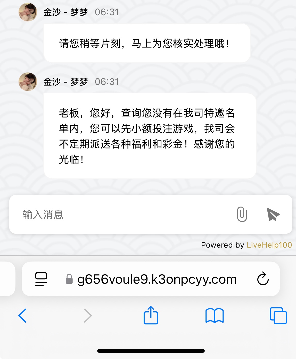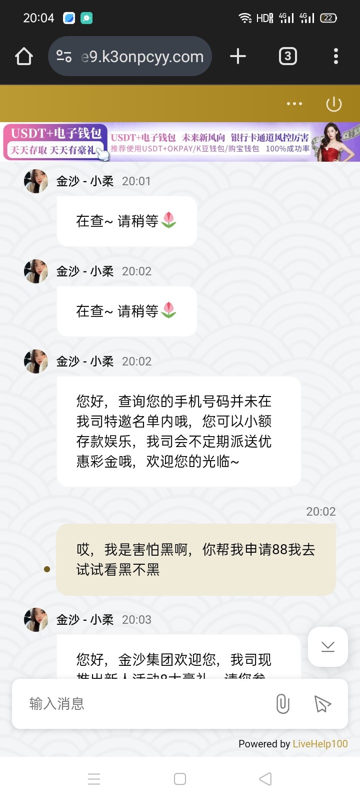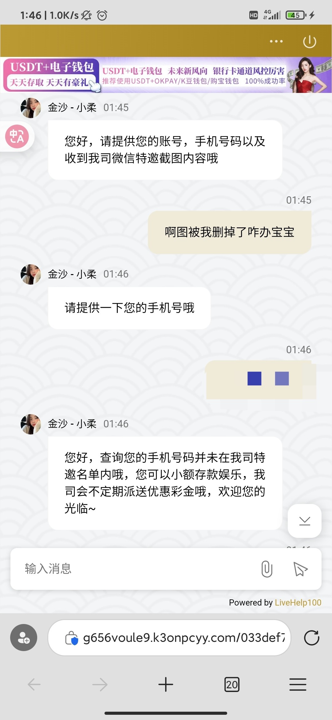 金沙 - 小柔01:33您好,查询您的手机号码并未在我司特邀名单内哦,您可以小额存款娱乐,我司会不定期派送优惠彩金哦,欢迎您的光临~ 内射你