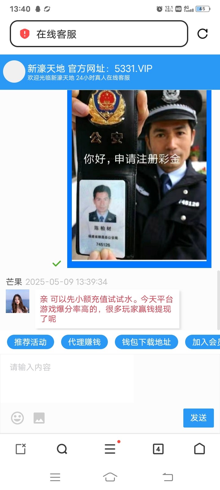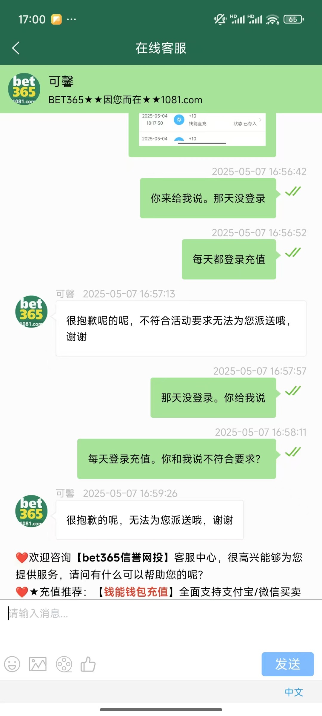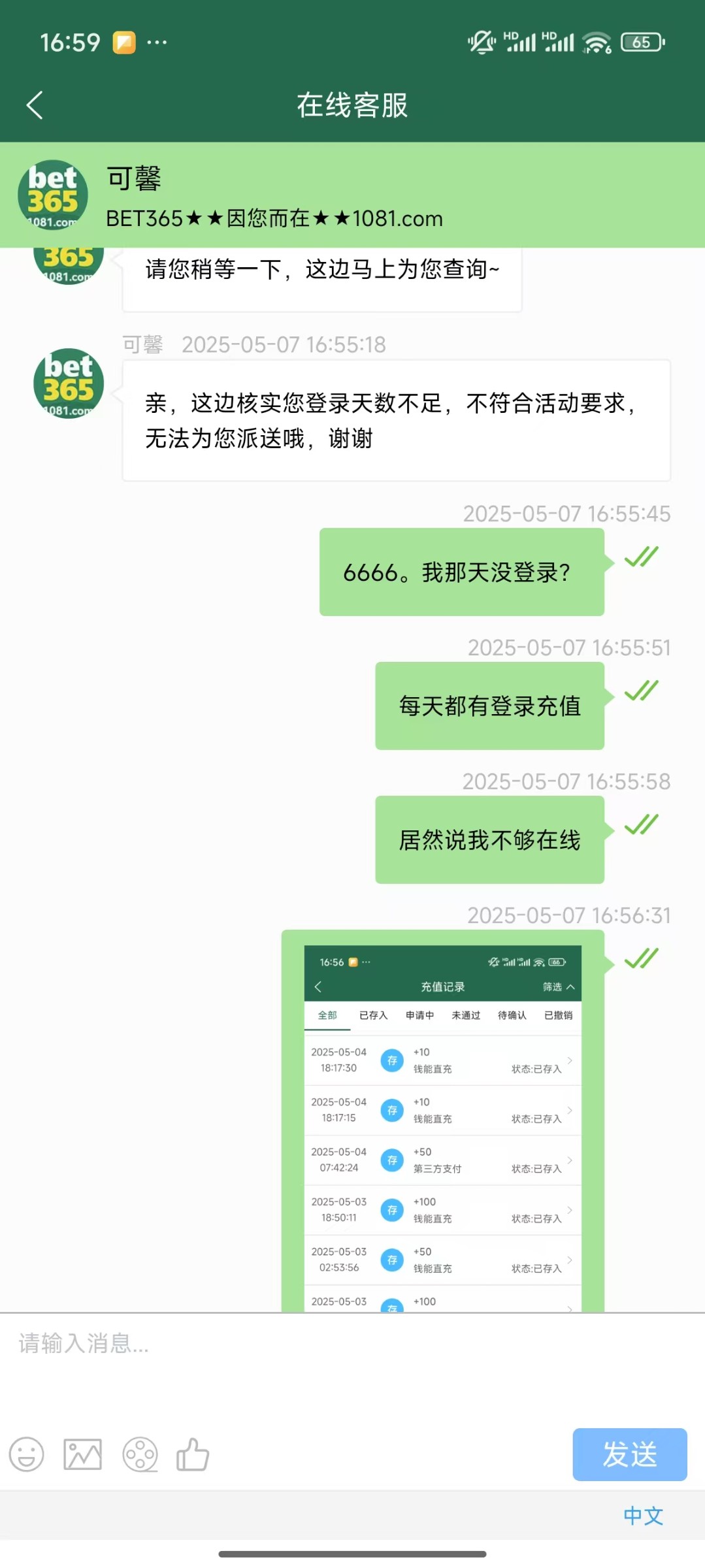 让你看看1036的。每天登录充值都说我不符合要求。系统自动审核不符合不派送。去反馈哪里,回复说五一活动重在参与嘛,系统审核不符合所以不派送。