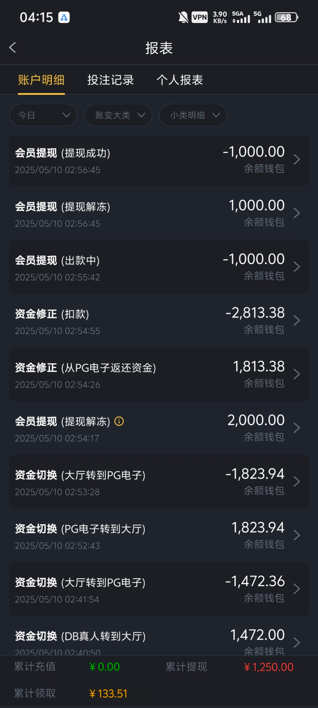 昨天最后上了一千 磨了四个多小时打到3000多提两千不给出 然后说站外对刷扣除盈利 哪个人对刷会冲三千多打将近三万打码 抽水都要抽死