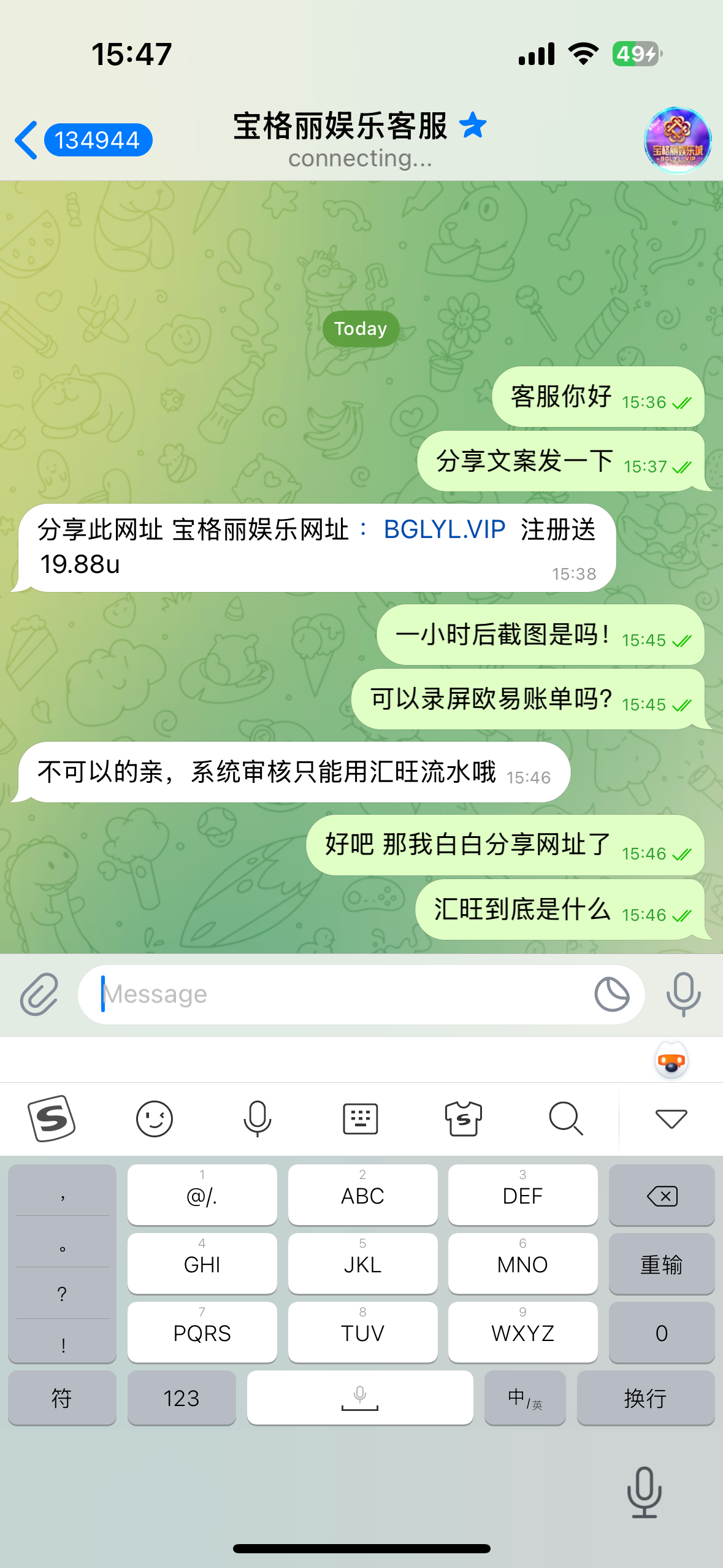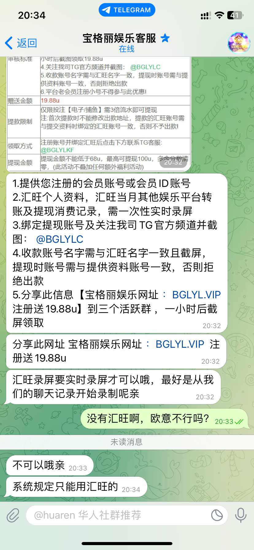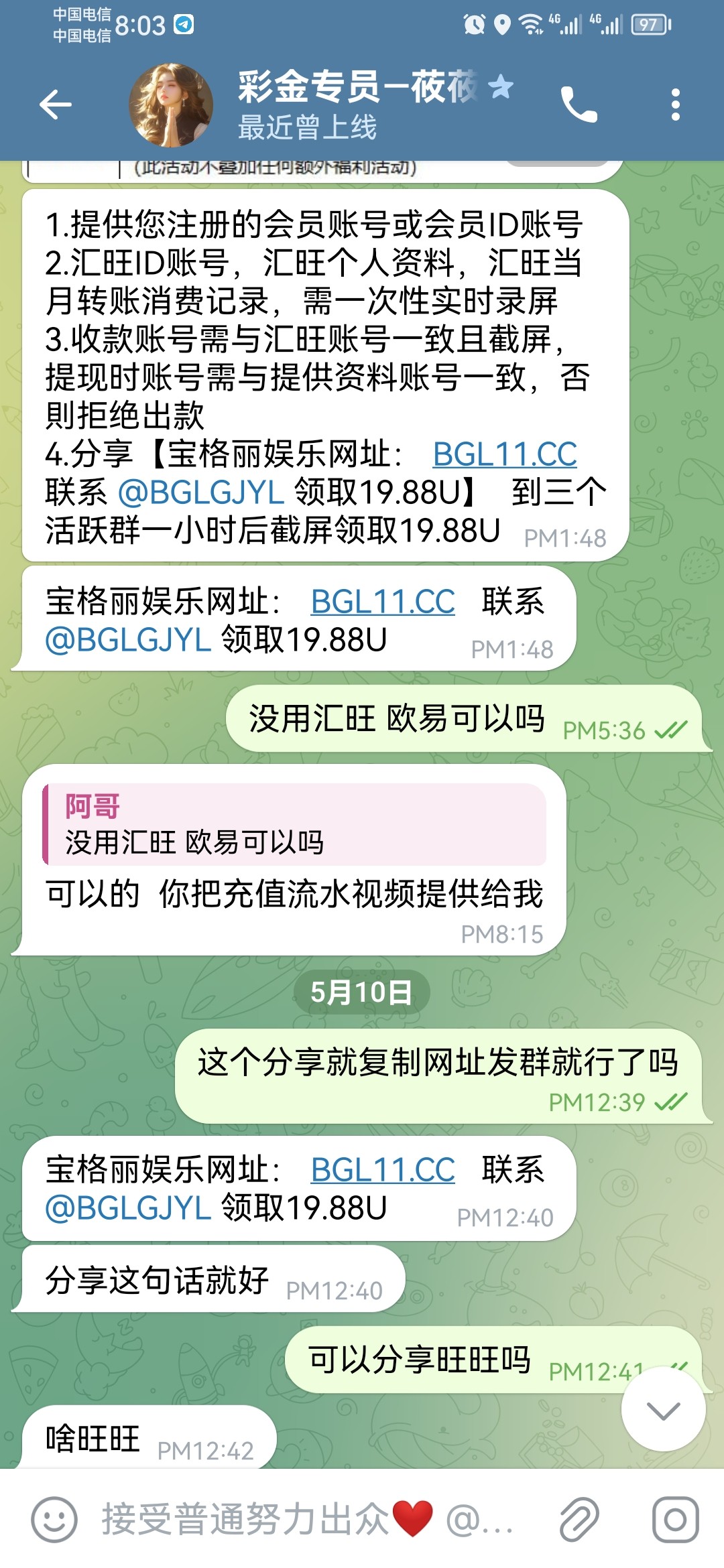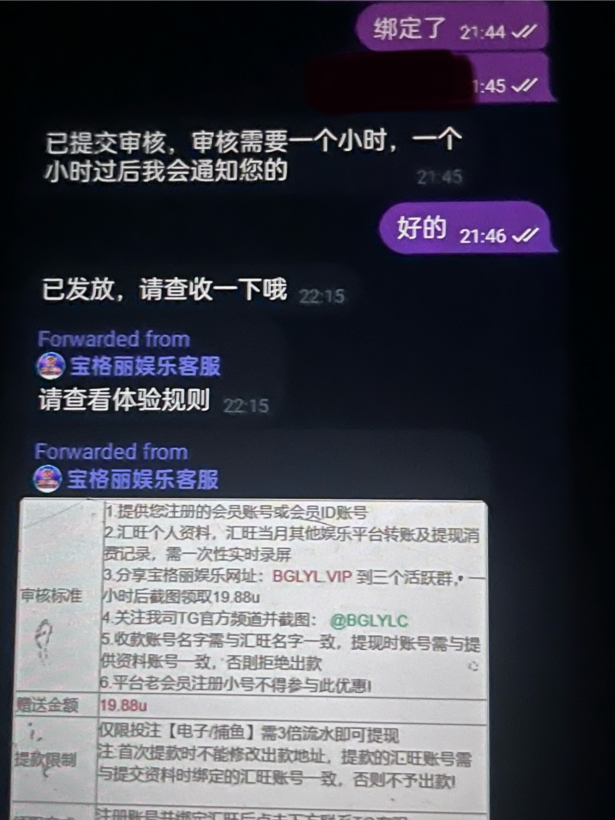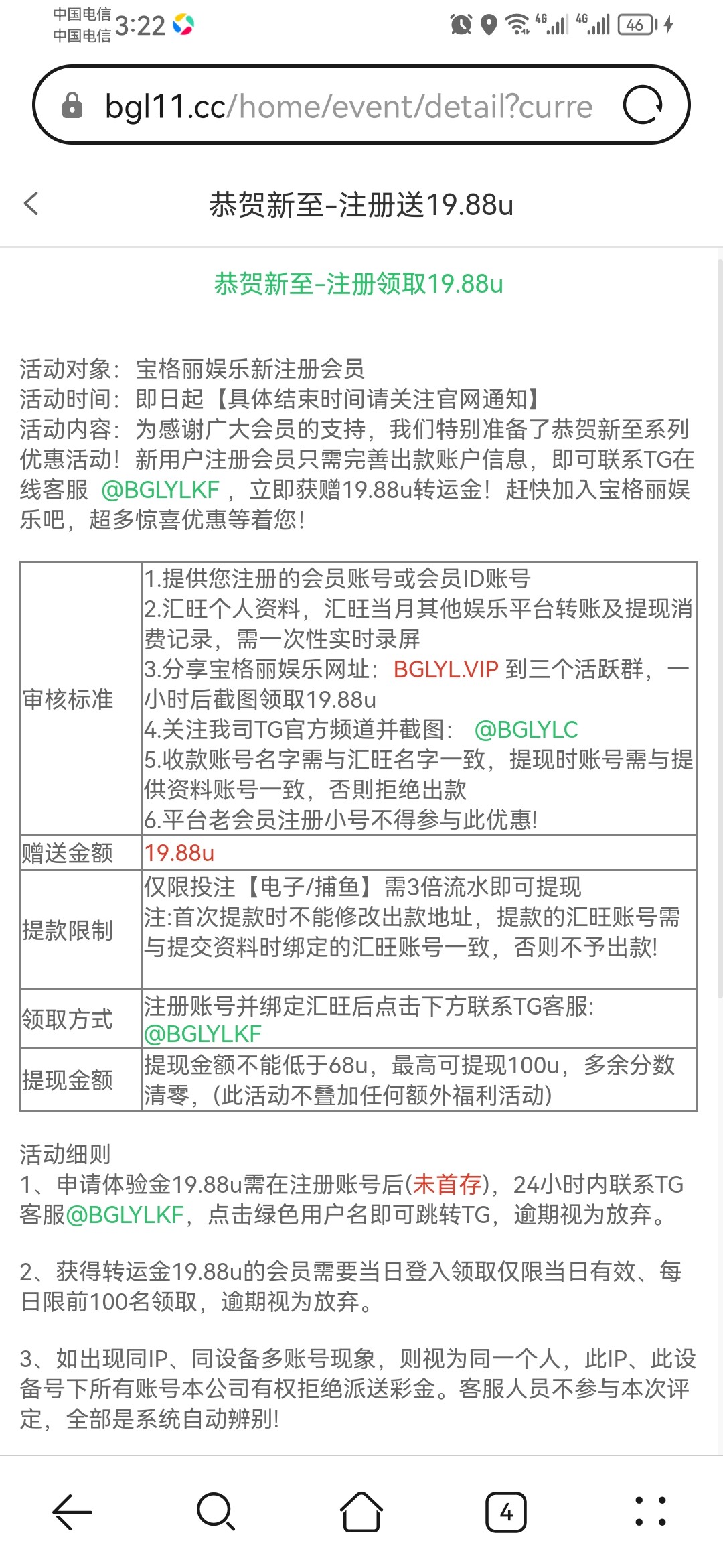 联系飞机TG彩金客服申请 没汇旺的可以录屏U地址 还需要分享三个群 http://bglyl.me