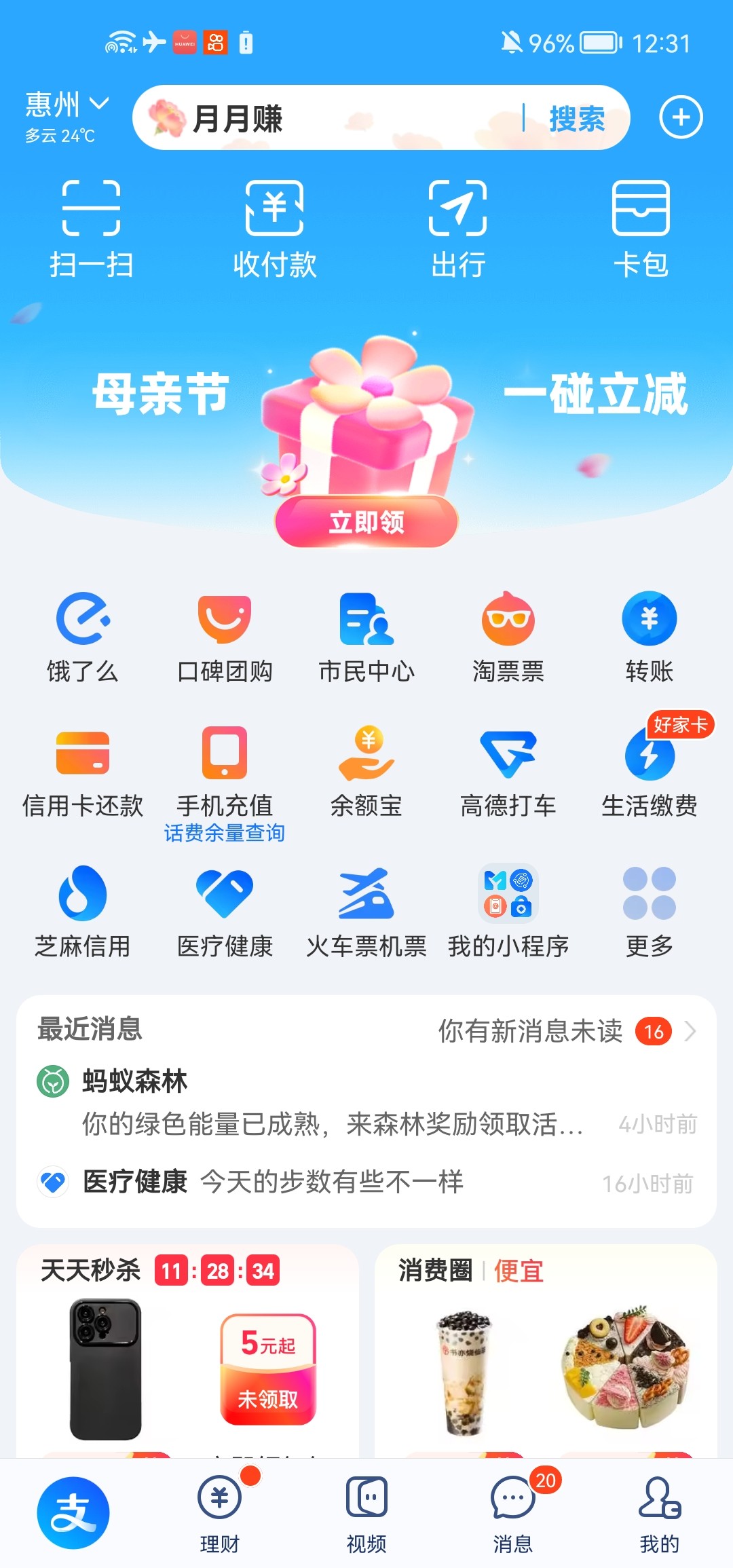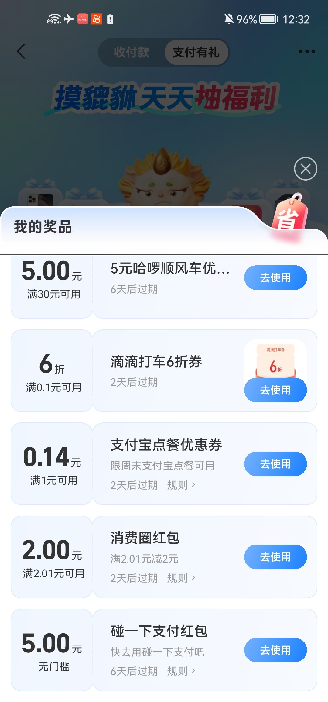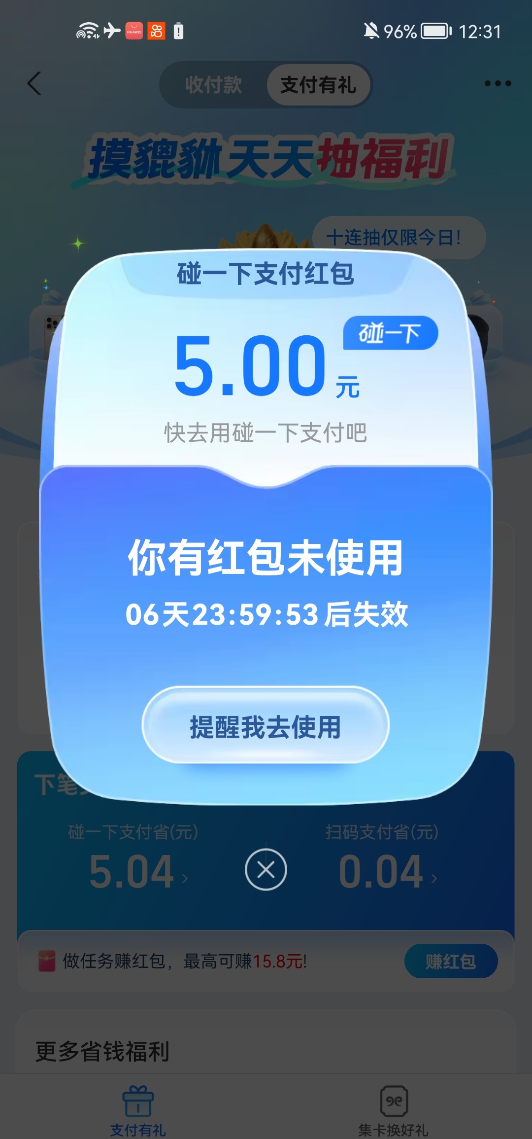 每个账号可以抽取10次,每次是必中的,有许多优惠券,第一次抽取必中碰一下支付红包,我是抽中了5元