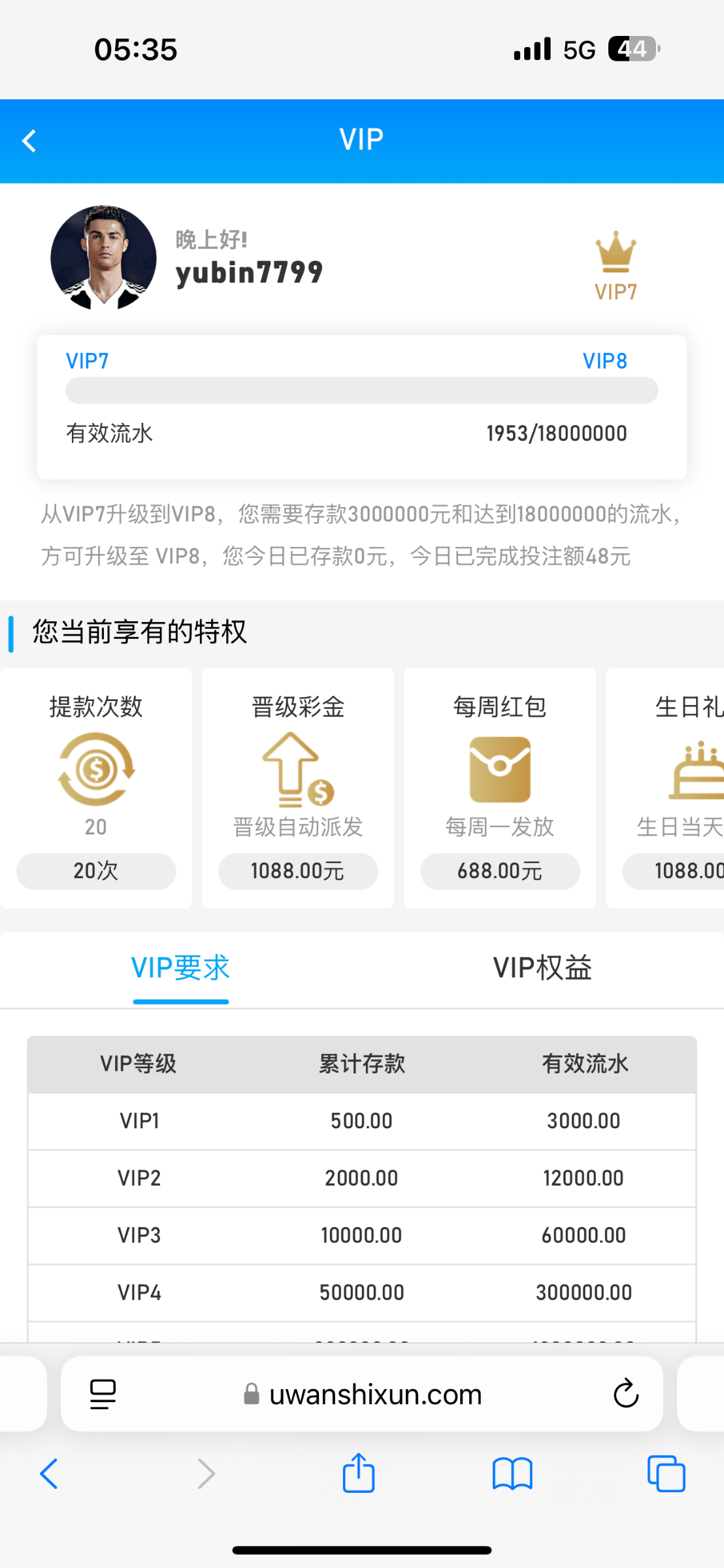UW体育成功升级VIP7 有哪个老哥比我高的等级
