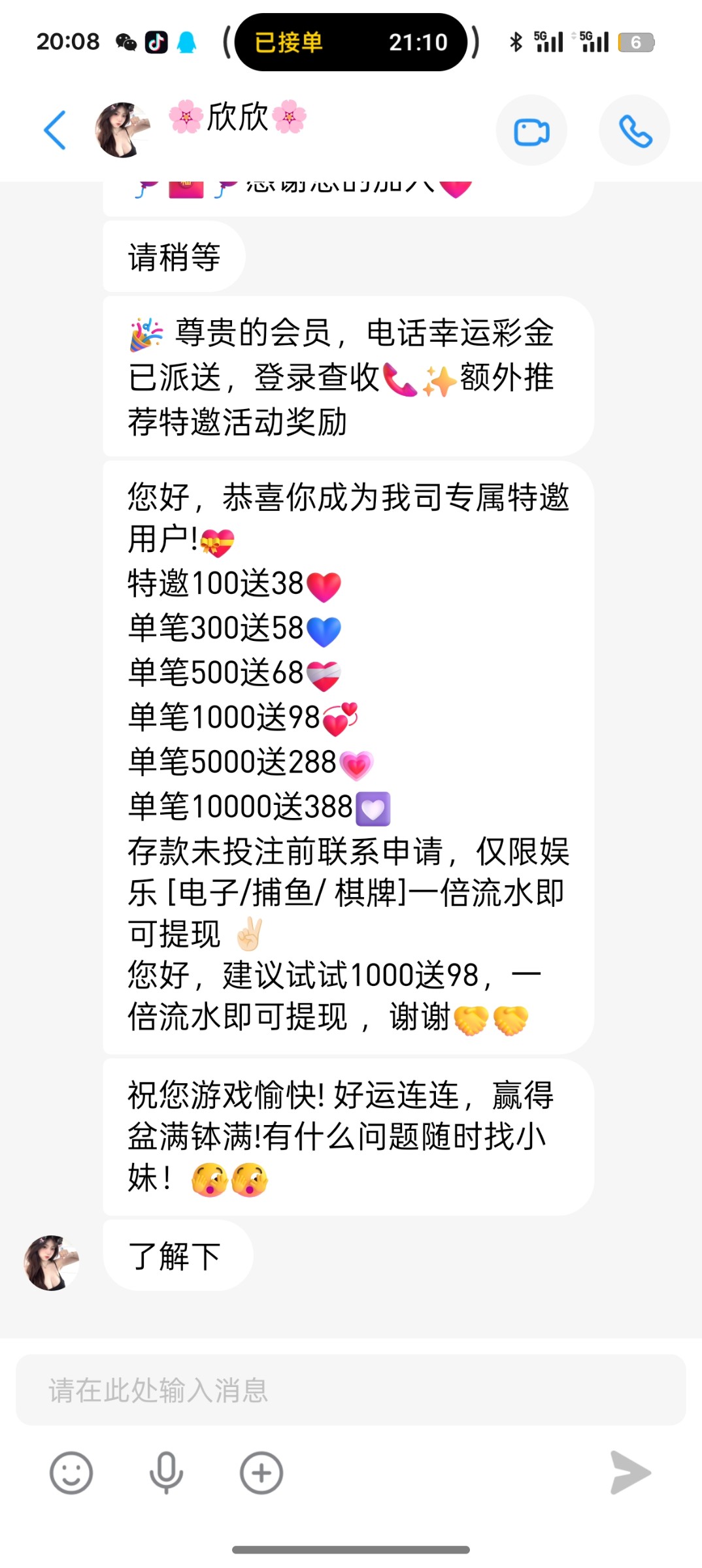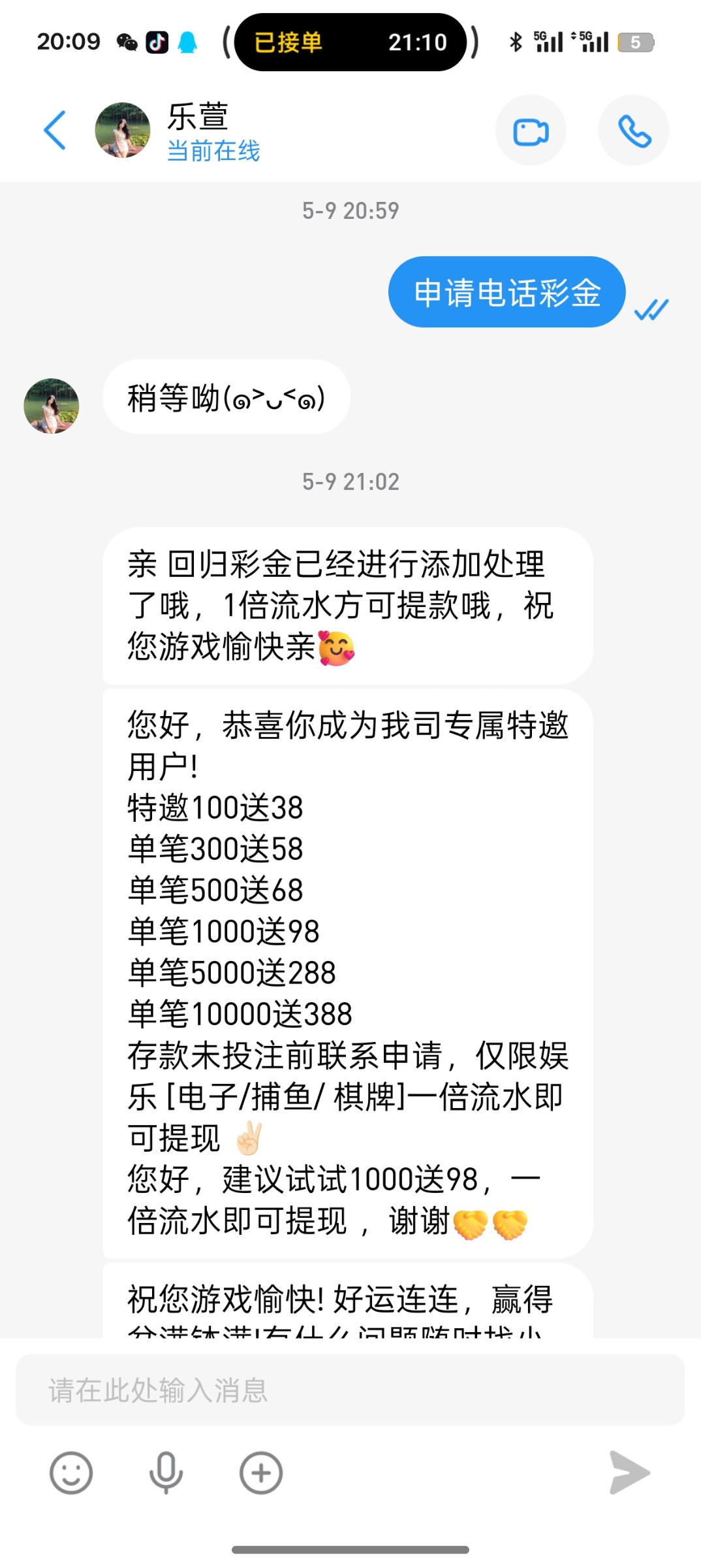 老用户找客服申请电话彩金电话随便截个图,我两个号都碰到了链接 6202.com