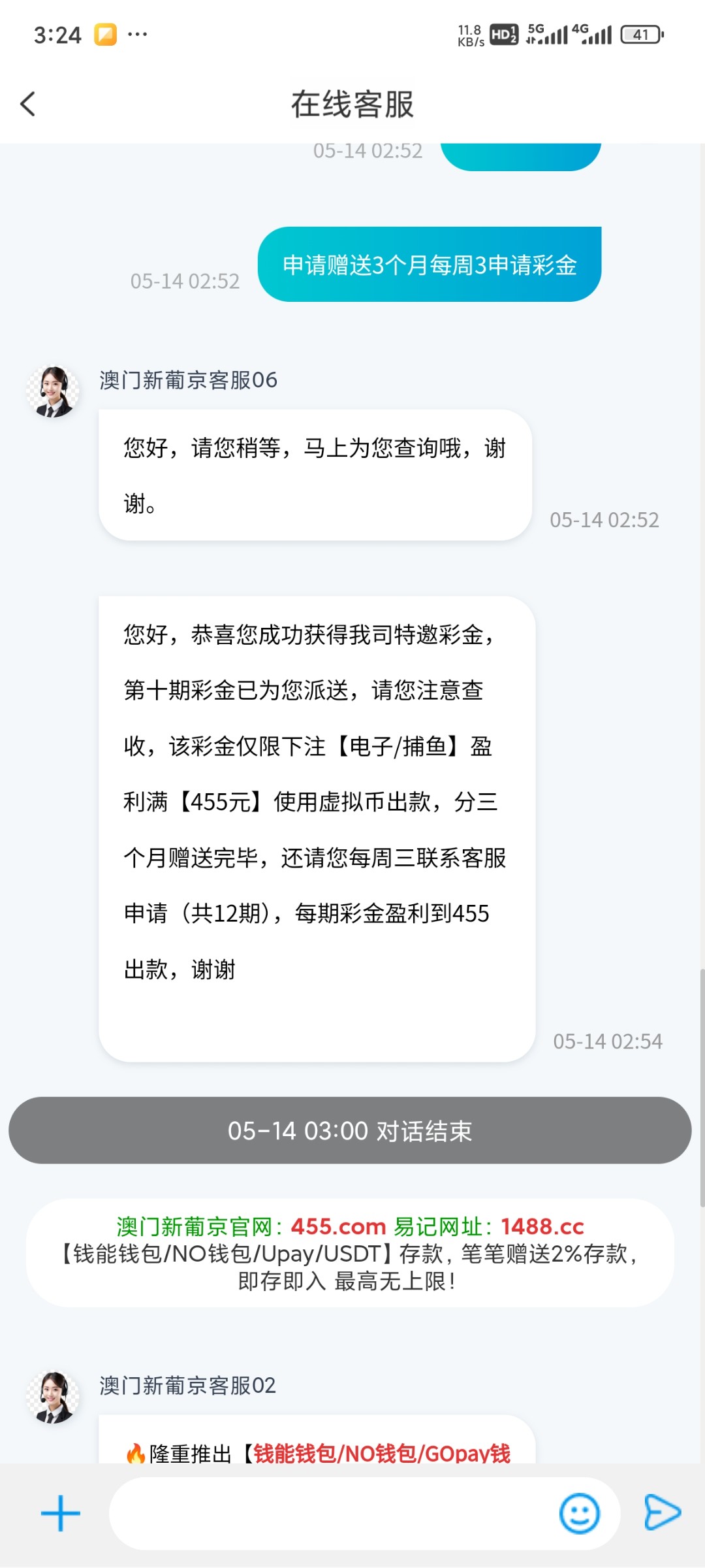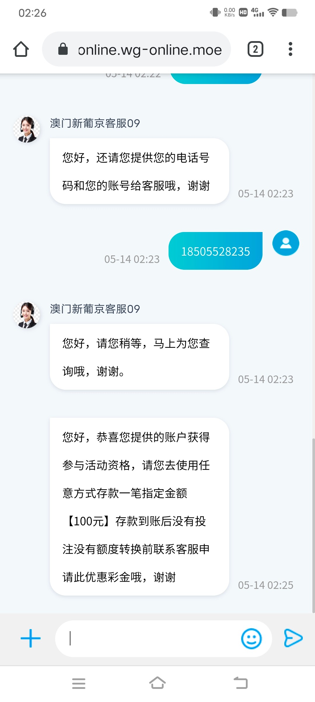 您好,恭喜您提供的账户获得参与活动资格,请您去使用任意方式存款一笔指定金额【100元】存款到账后没有投注没有额度转换前联系客服申请此优惠彩金哦,谢谢