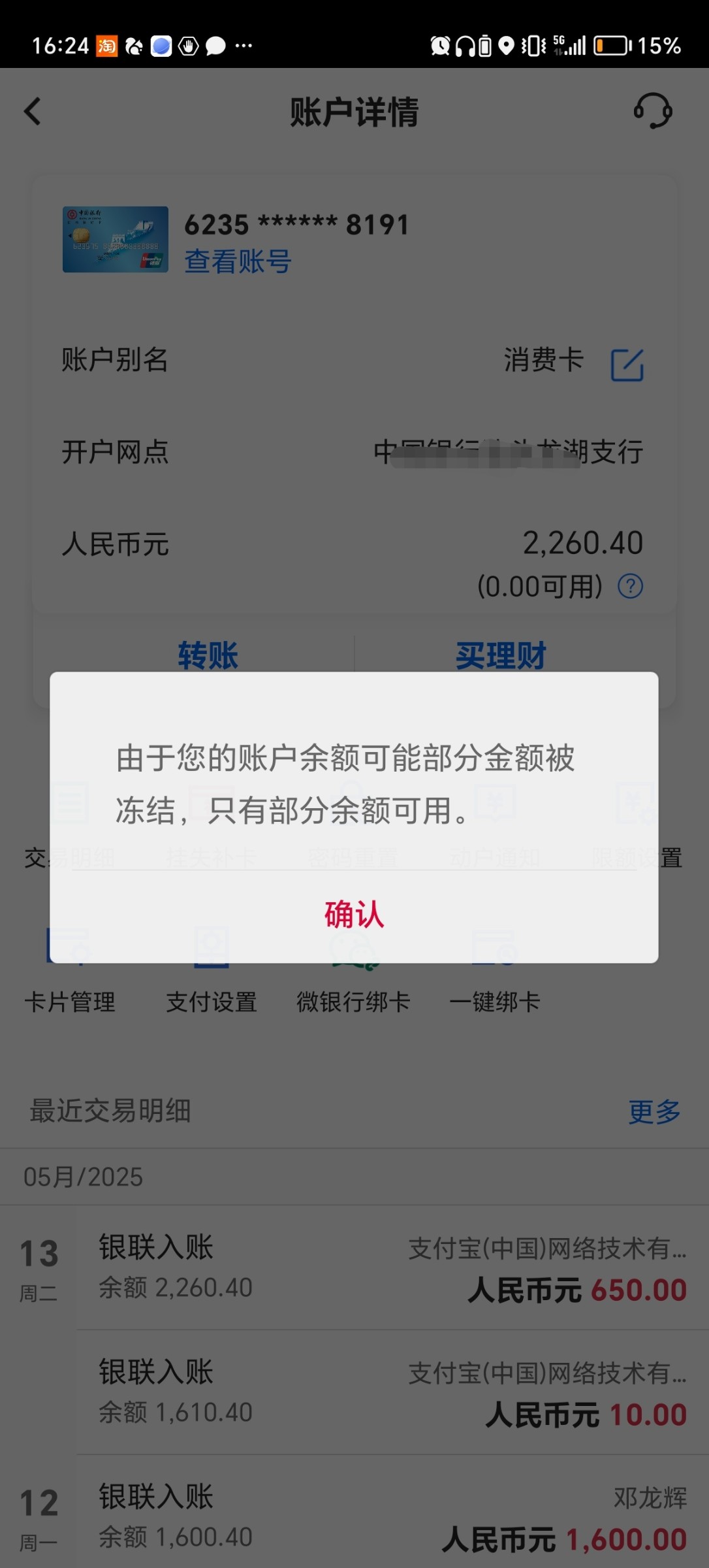 各种大哥,有没有了解一些提款提银行卡被冻结的 我前天晚上9点提了一个1600到卡里面秒被冻结。然后昨天白天打电话问开户行他们那边说是被江西那边的公安刑侦冻结的。希望大哥们能够发表自己的看法谢谢各位了。对了那个钱是支付宝转卡进账的。
