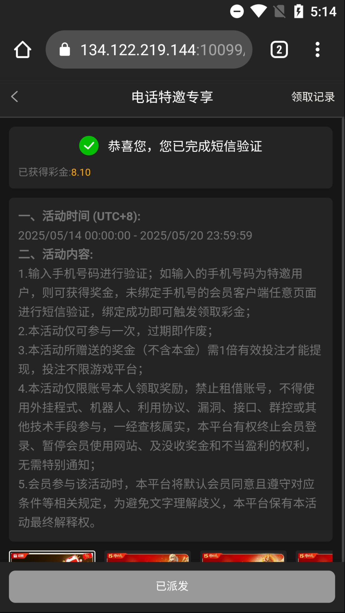 这是机器人说的网址:70668.vip 机器人来的电话,说领彩金,但是我之前领过了,然后我把号码换掉重新注册换了个账号然后领了8块钱,最后提现了406到账了,别充值,我看有很多老哥都说黑,没想到也出款成功了。