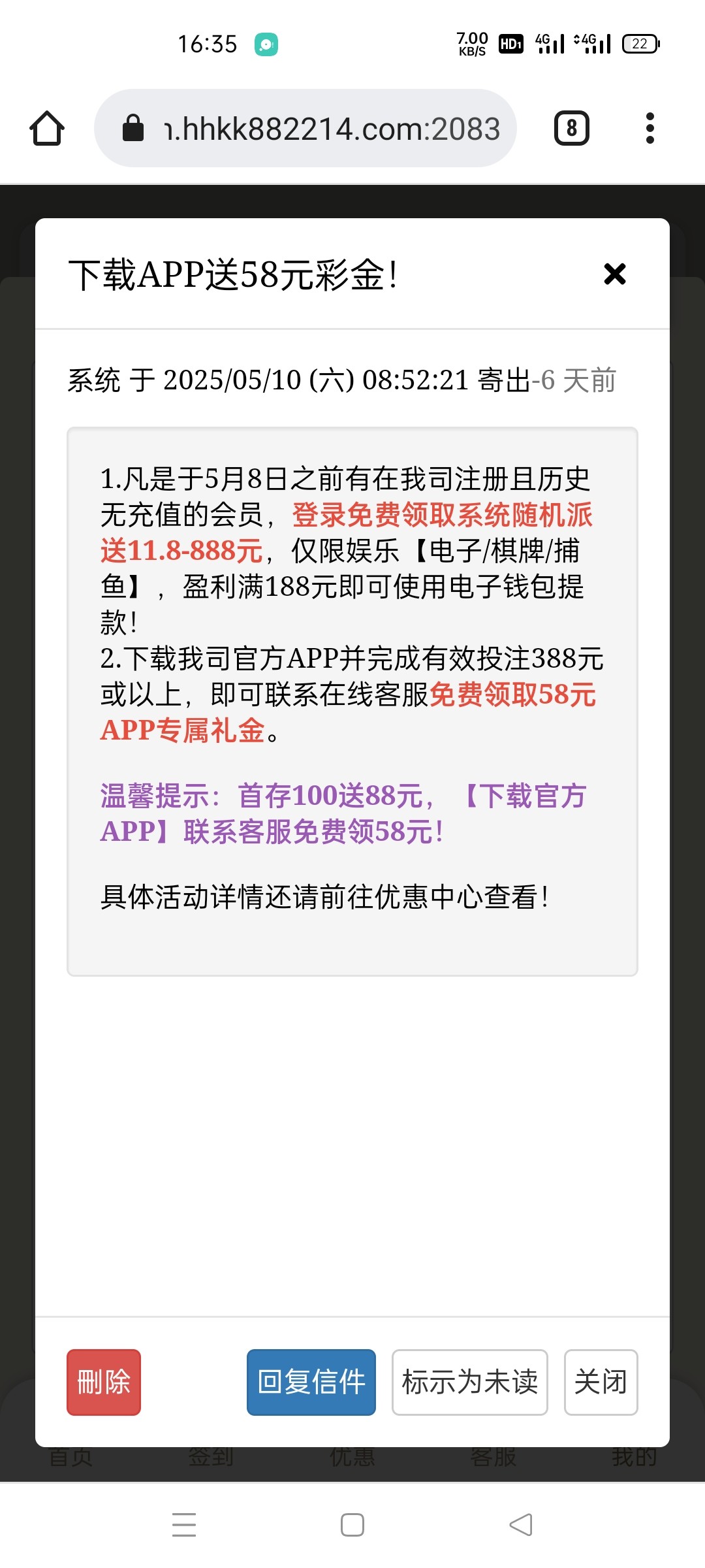 刚接到的电话跟我说是神秘彩金,登录上去就有,没充值过,刚看了一下站内信显示这个,有号的老哥可以上去看一下 8822.com