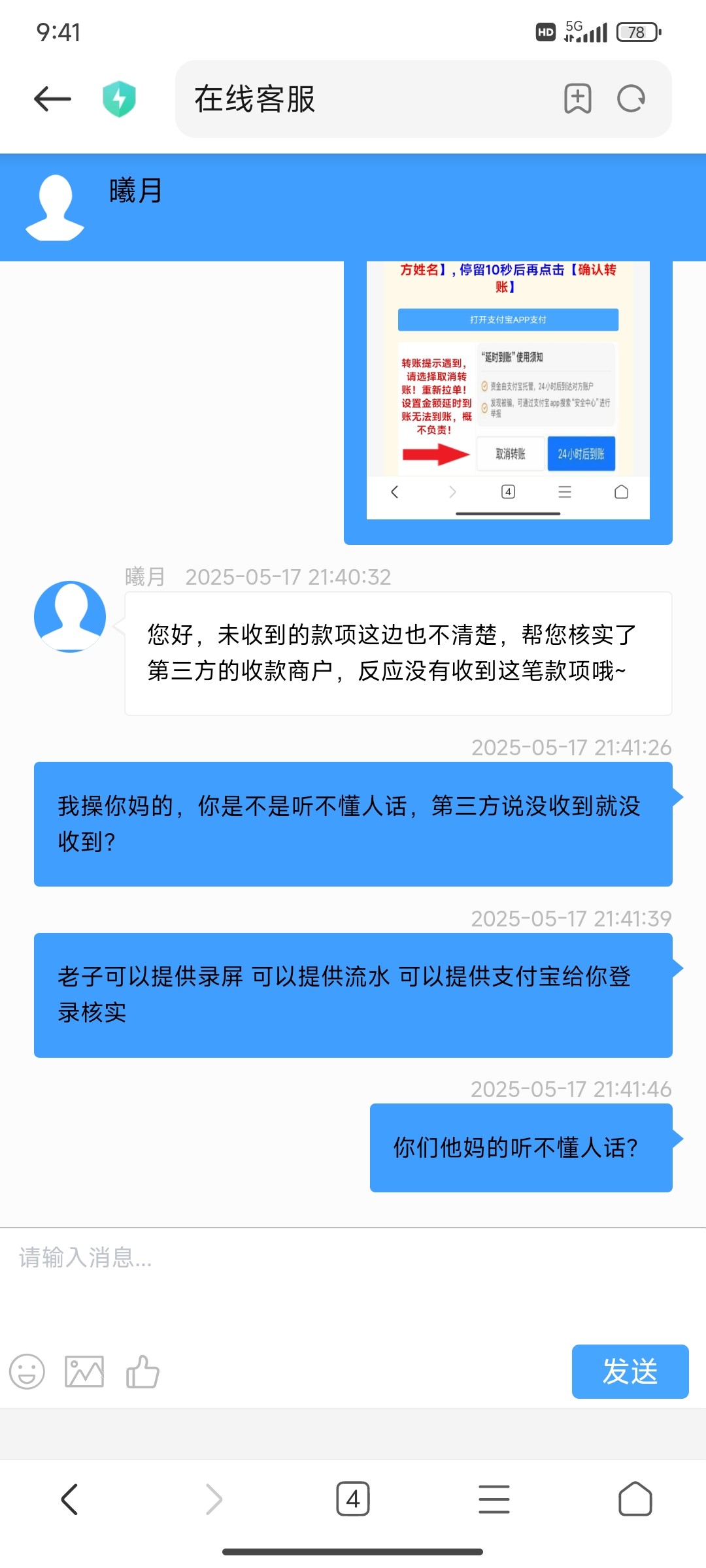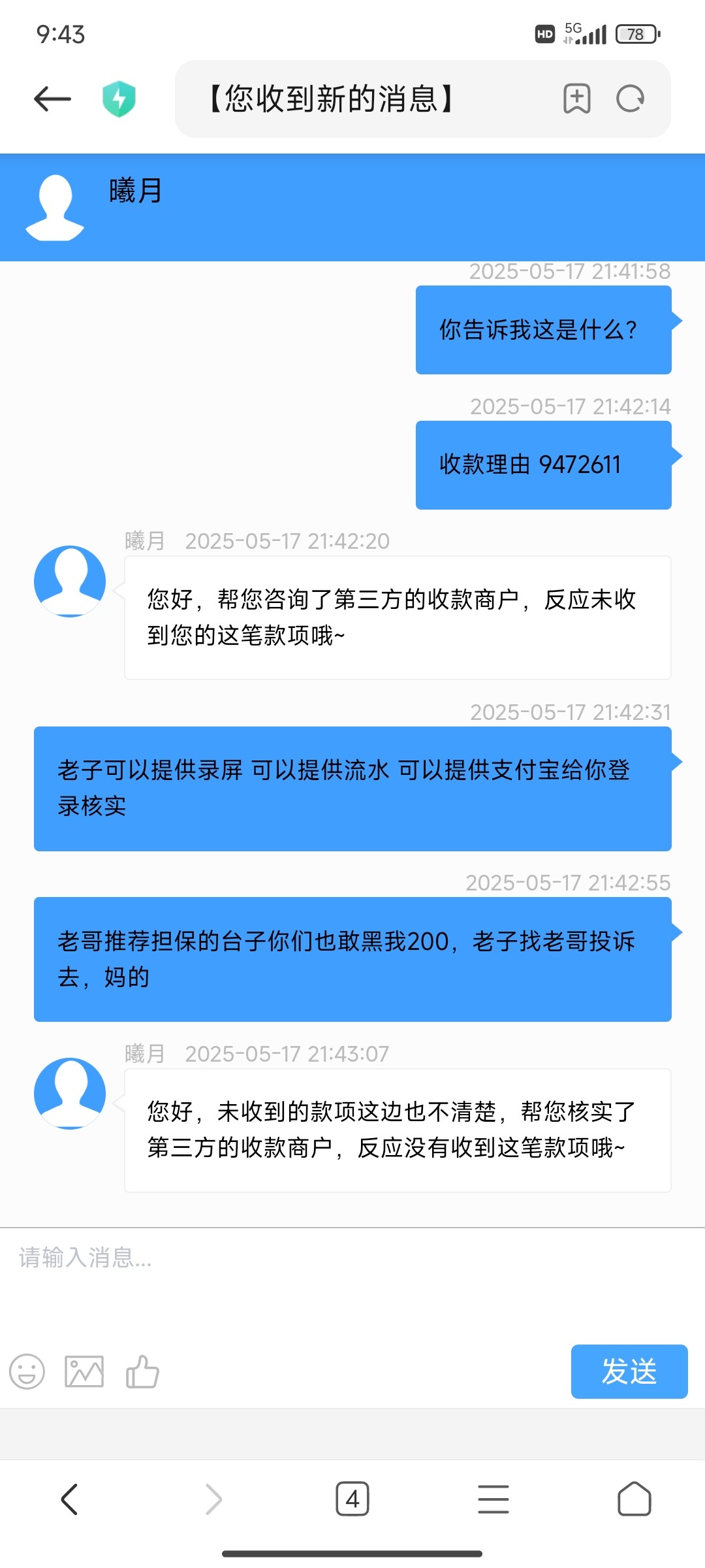老哥首页广告区大发908,黑我200元充值,一句第三方没有收到钱直接人机回复不处理,这个月陆陆续续输了三四千,没想到最后二百块家当也黑,我已经找老哥投诉了,各位注意一点吧。 给客服提供支付宝录屏 流水 让客服第三方上我支付宝核实都不搭理,真踏吗气人我草