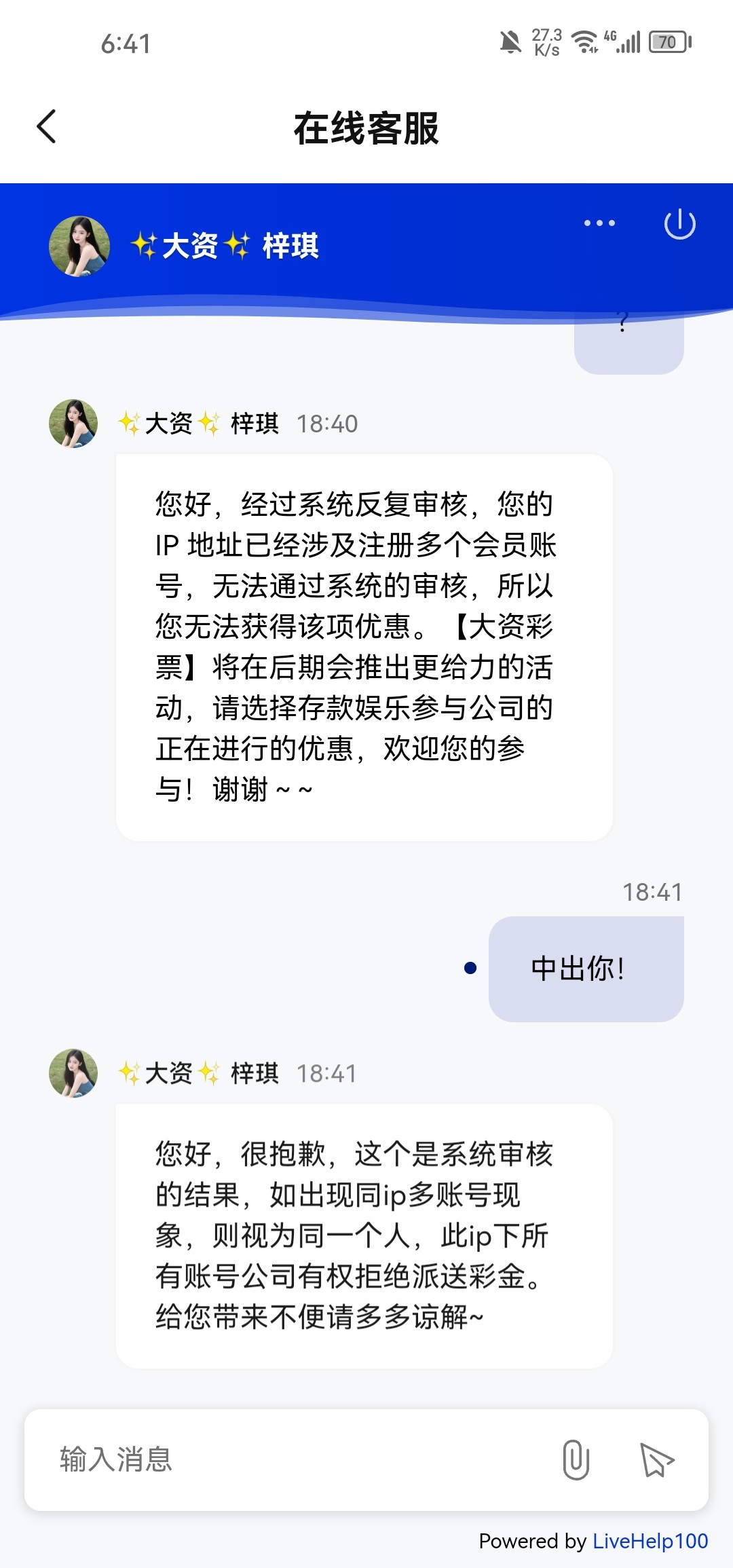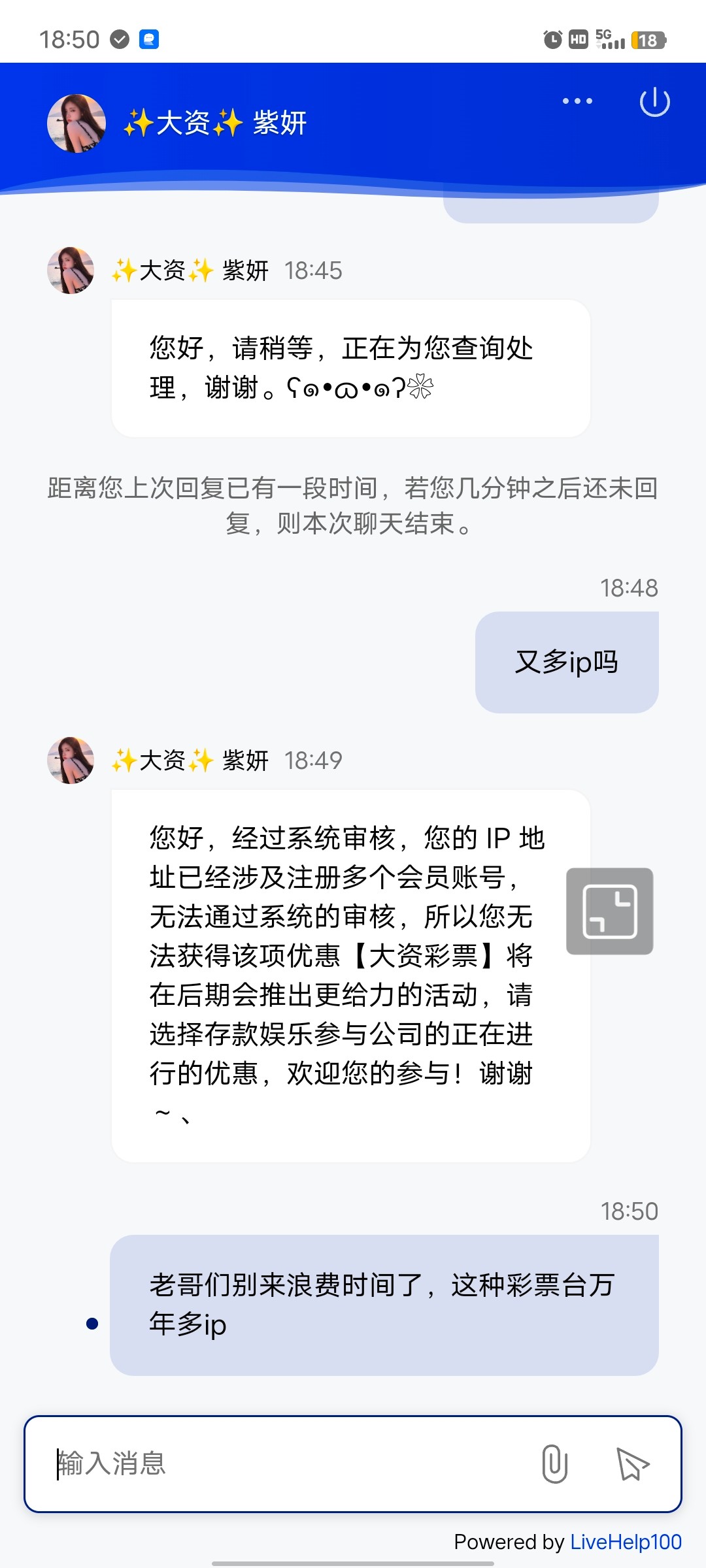 您好,经过系统审核,您的IP地址已经涉及注册多个会员账号,无法通过系统的审核,所以您无法获得该项优惠【大资彩票】将在后期会推出更给力的活动,请选择存款娱乐参与公司的正在进行的优惠,欢迎您的参与!谢谢~