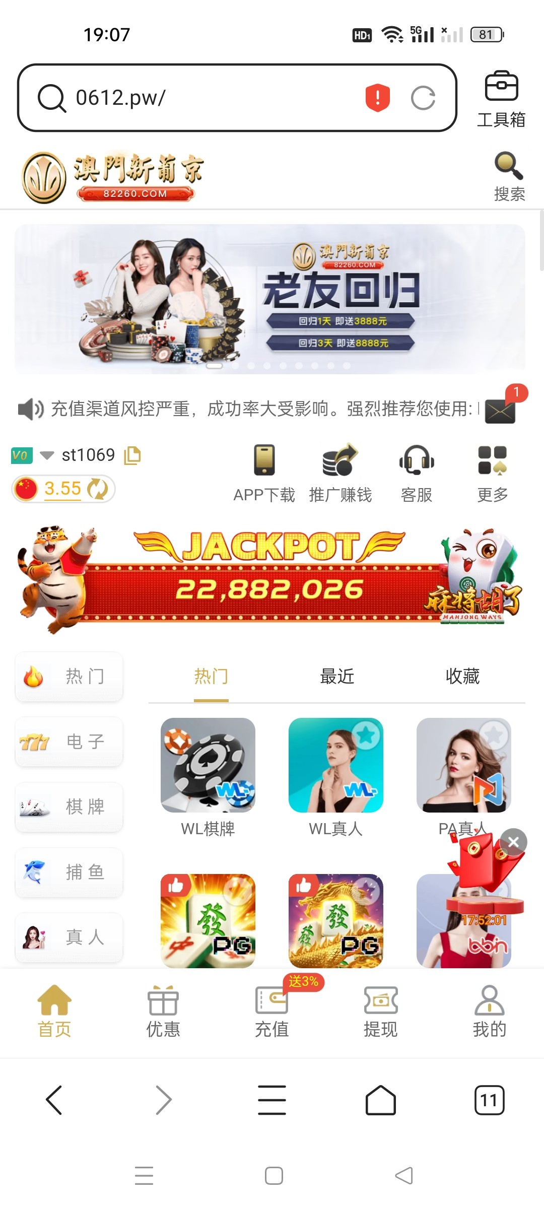 找在线客服,问是不是合并了,客服会提供飞鸽客服让你添加领取彩金,飞鸽那边会赠送18元彩金,不限游戏,只能出款100。我没有打出来,也没有充值,出款自测。网址:0612.pw