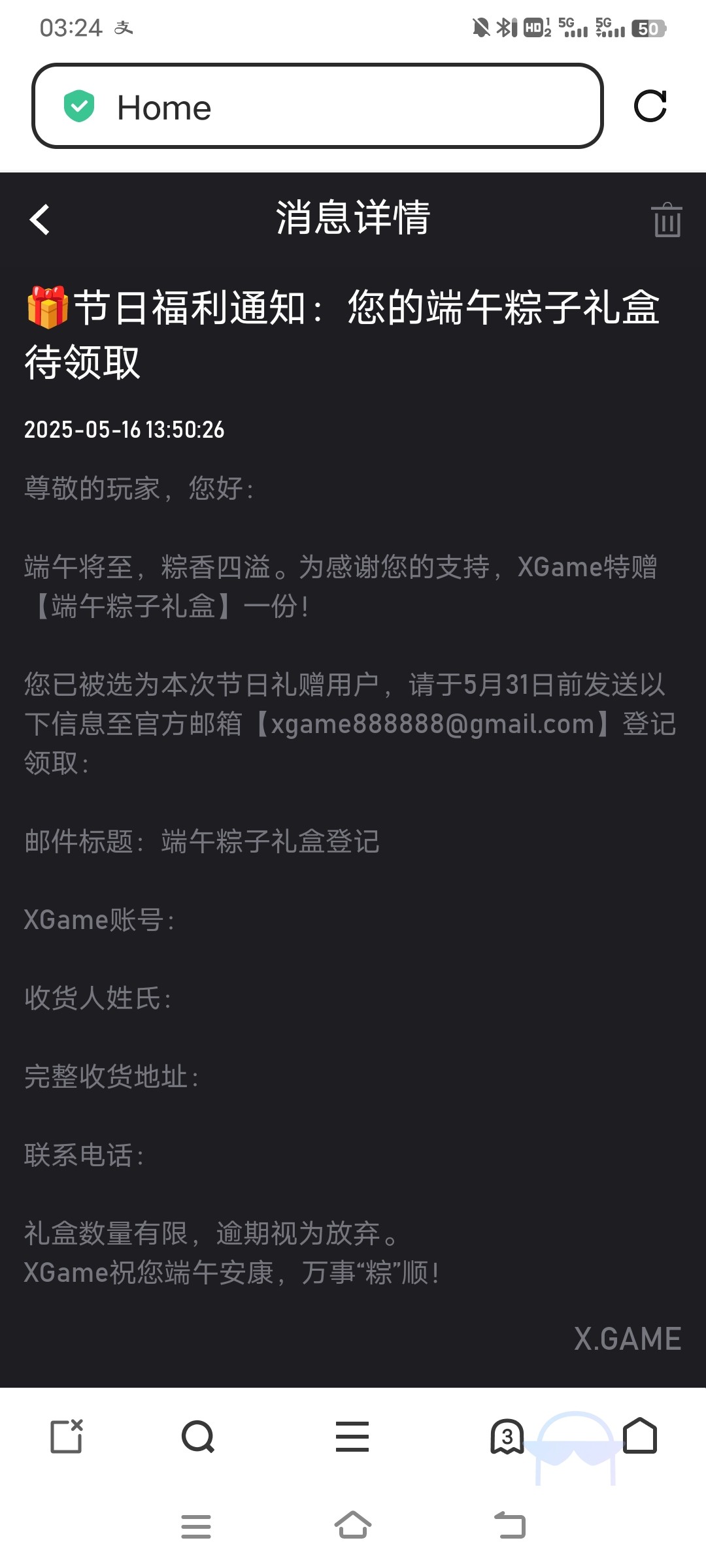 狗庄发粽子了。xgame平台。兄弟们上去看看站内信有就有