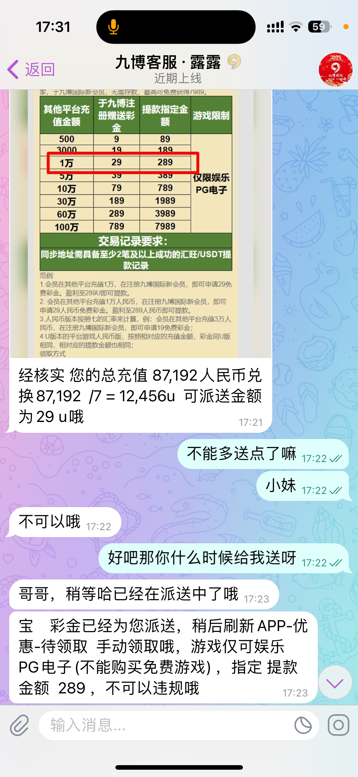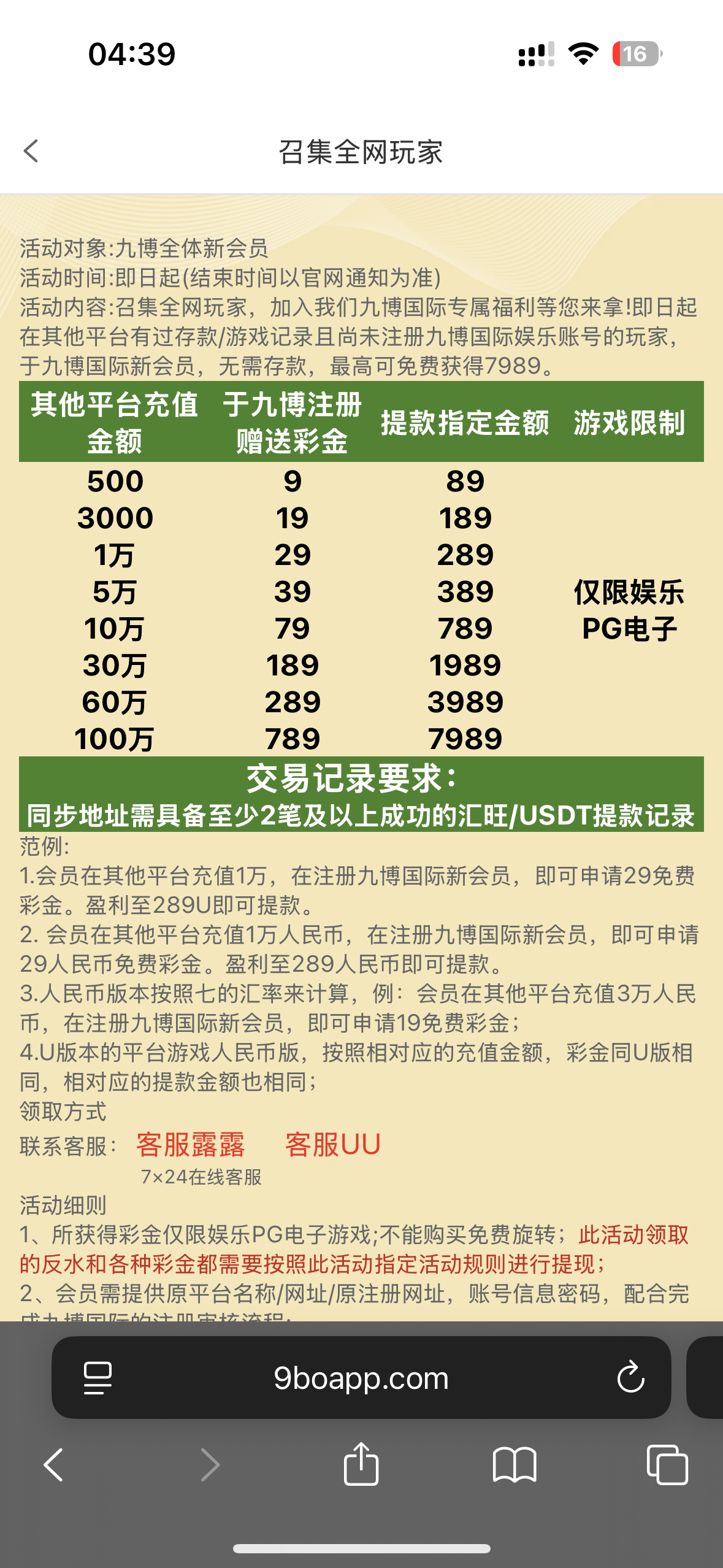 注册账号 然后联系飞机客服 提供别的平台账户密码 查你的充值记录 这个查记录 要有那种显示总和金额的 或者联系你提供的平台的客服 客服告诉你你一共充值了多少的才行 还要有提款usdt的记录 我申请到了 其他平台有大额充值的 可以撸试试 飞机客服号@jiubo_vip 平台网址 9bo.com