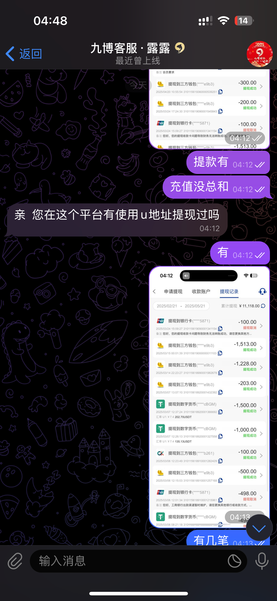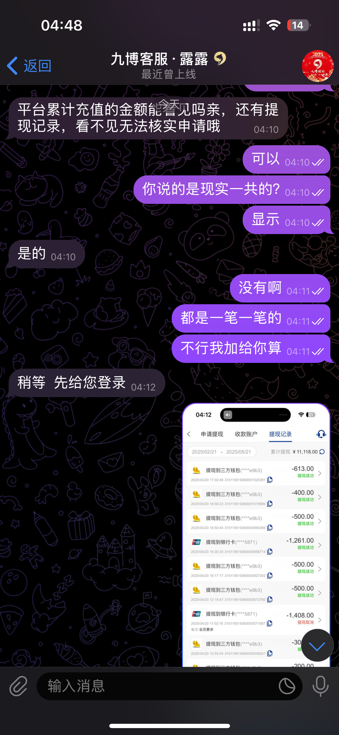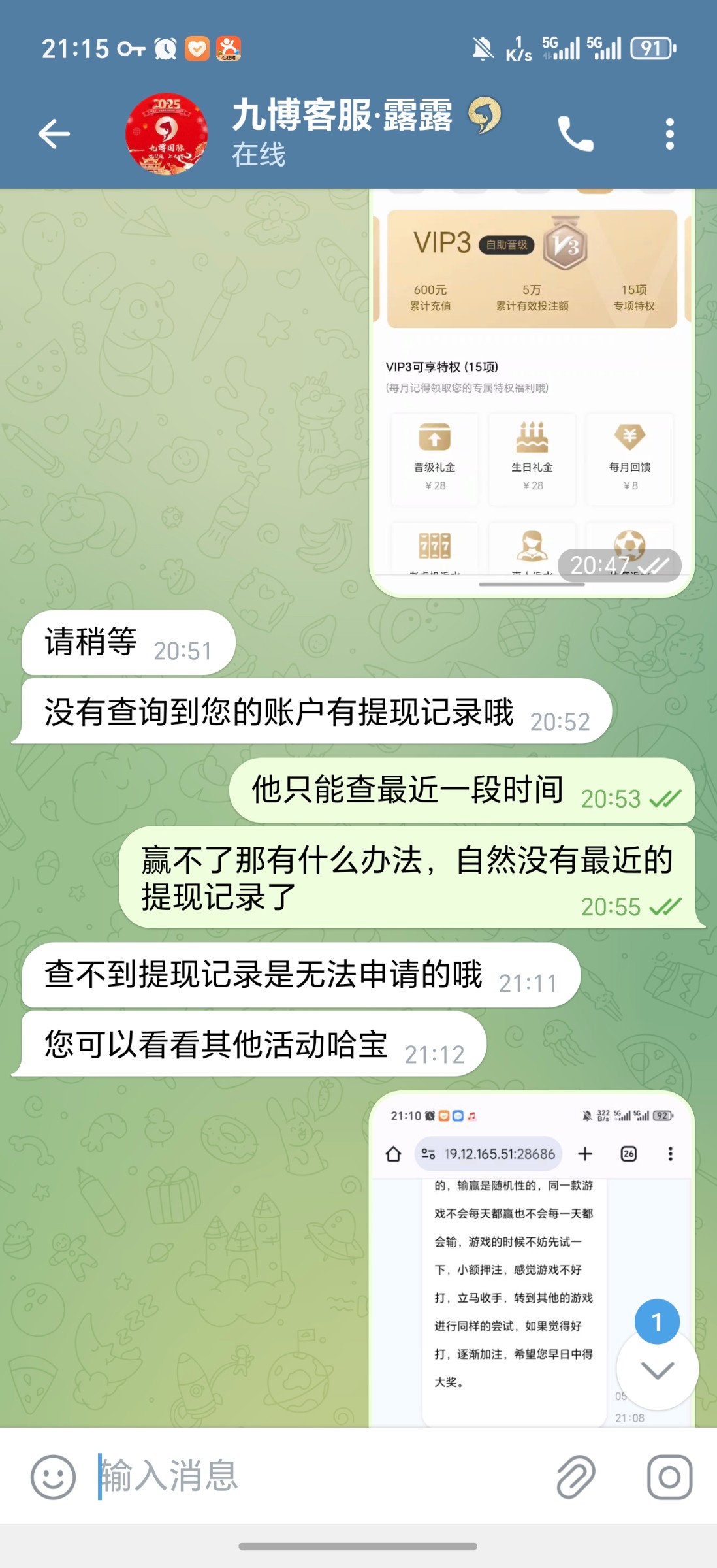 客服玩不起,磨磨唧唧三个小时才回消息,说的写的累计充值,完了跟你说查不到提现记录,不给送,平台设置只能查三十天那有什么办法,有累计充值跟最近充值记录,那赢不了没有提现记录不是很正常。找客服才查得到具体的。客服不给你送随便找个理由就行了