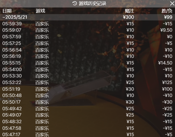 下注庄闲的胜率还是不太好,还好中间运气可以了,抓住了一手10块的和,对子,才把前面输的给打回来,最后搞了个100的盈利也算是可以了。