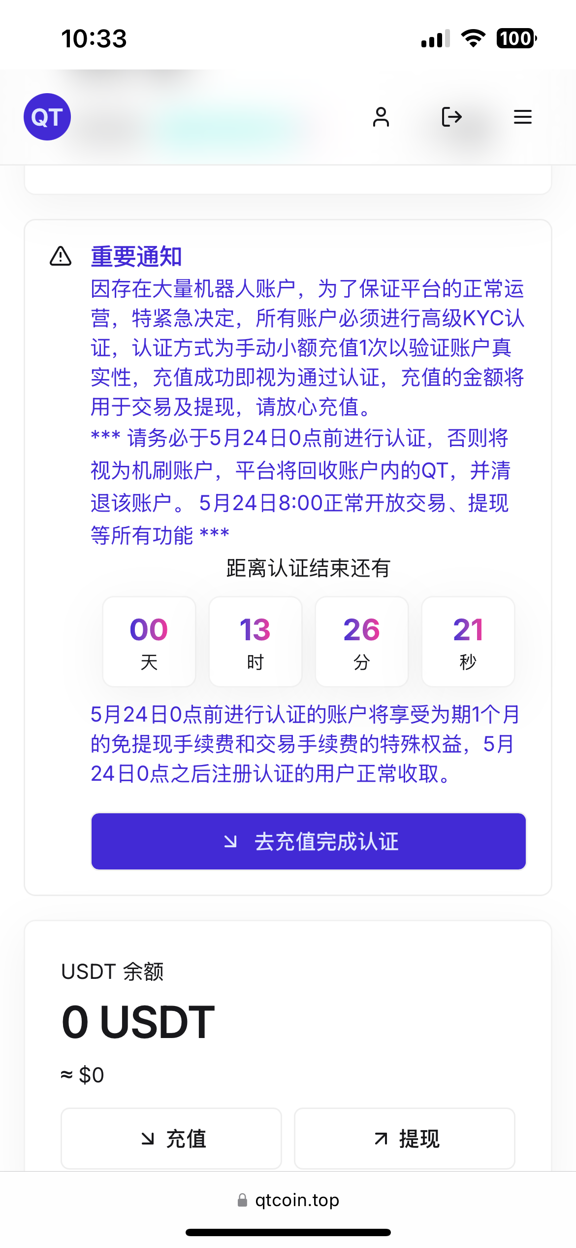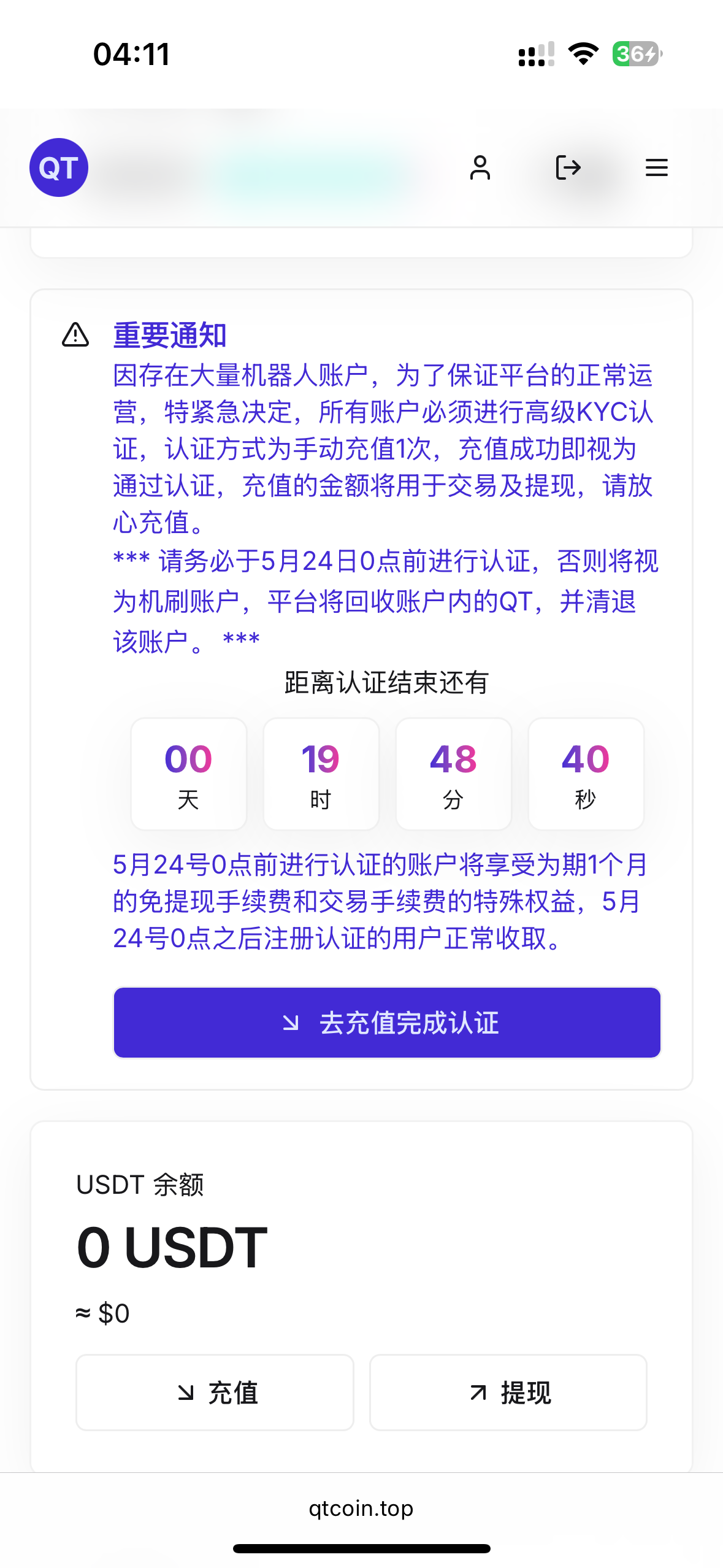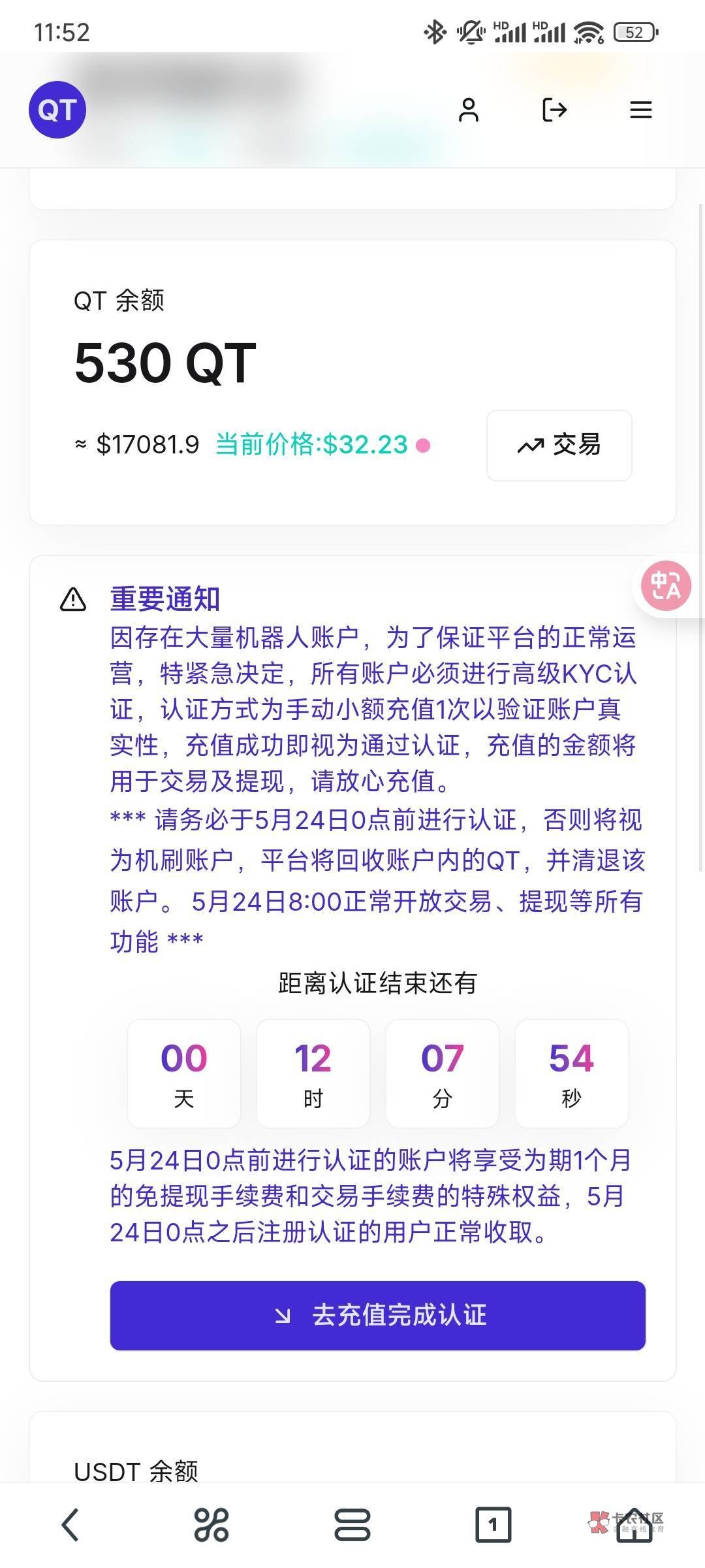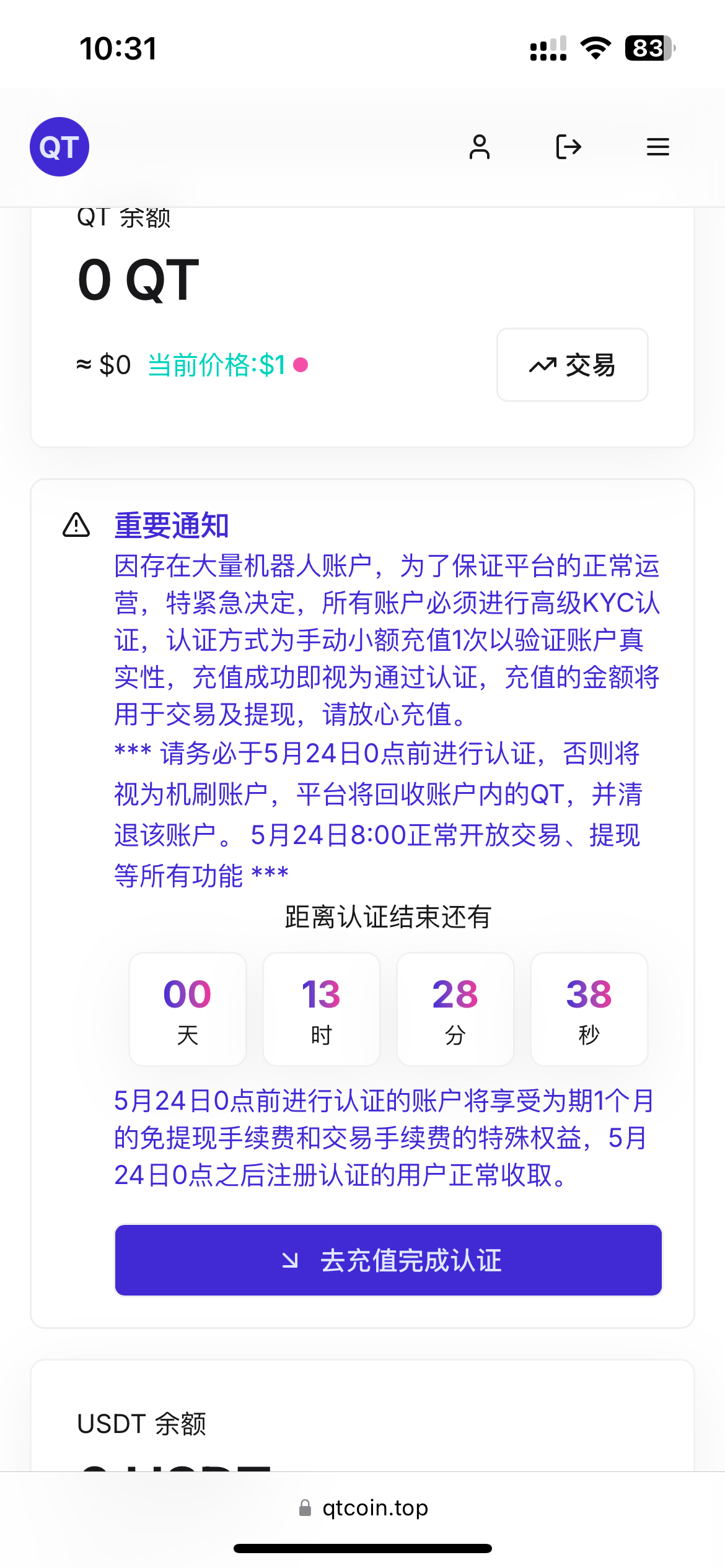 ***  请务必于5月24日0点前进行认证,否则将视为机刷账户,平台将回收账户内的QT,并清退该账户。  5月24日8:00正常开放交易、提现等所有功能  ***          最低充值10u,傻逼平台以为这样能骗到钱?