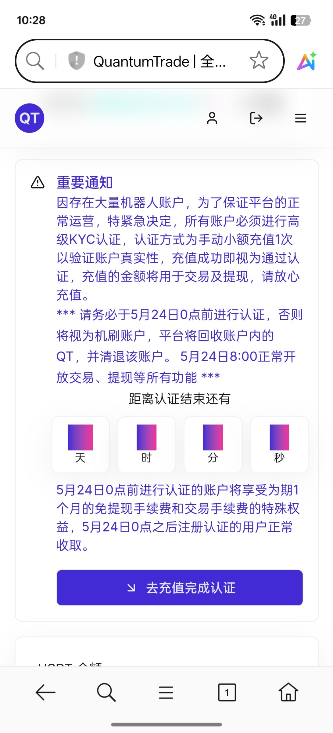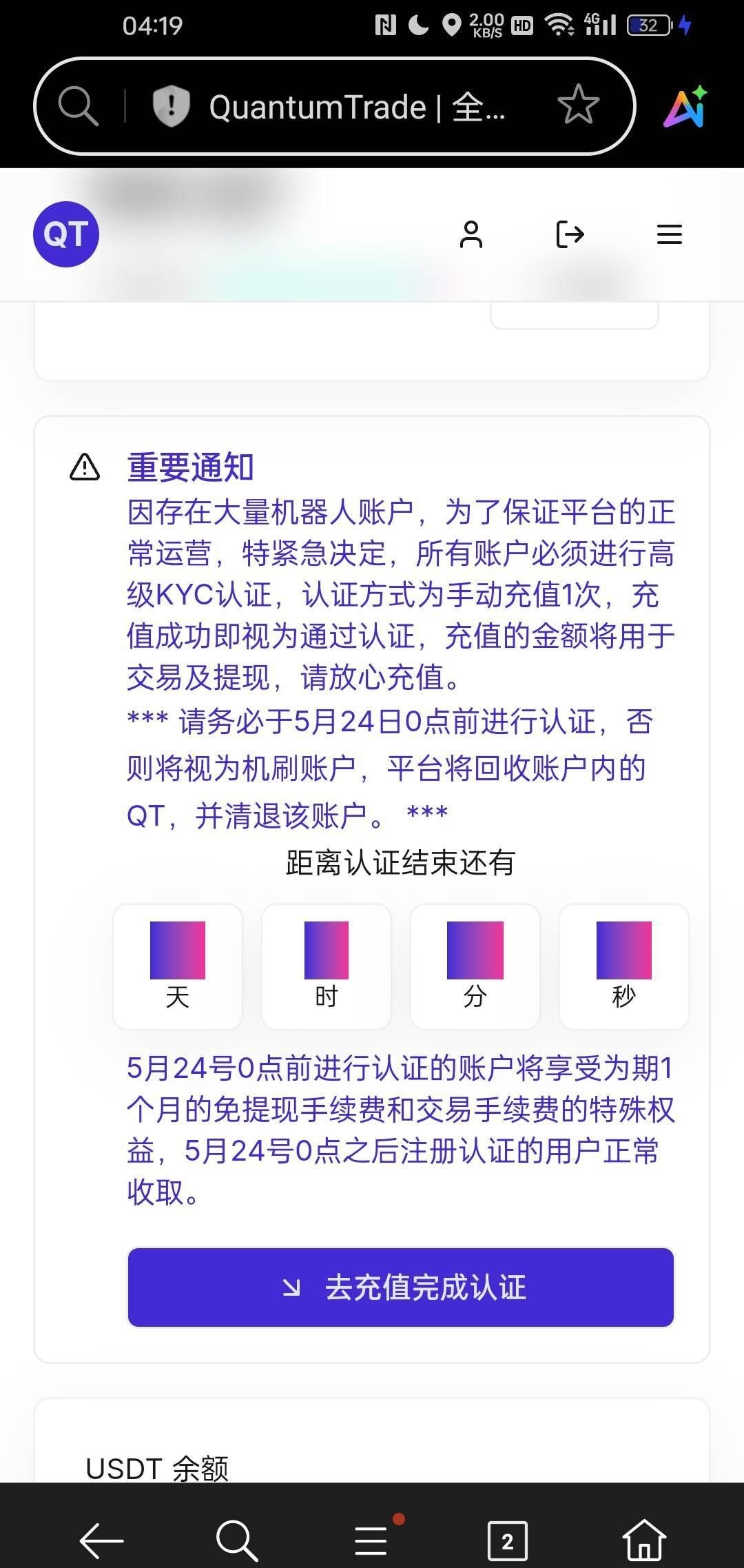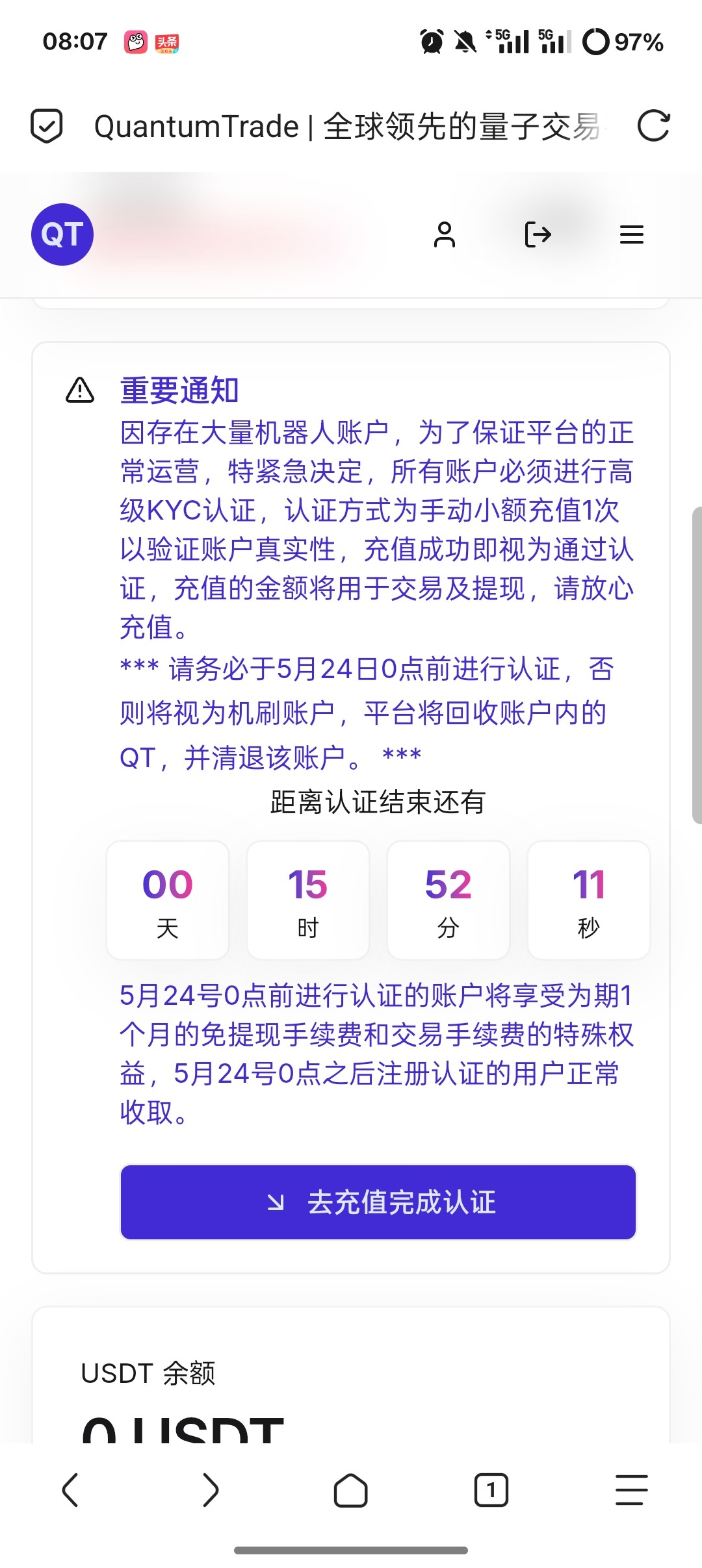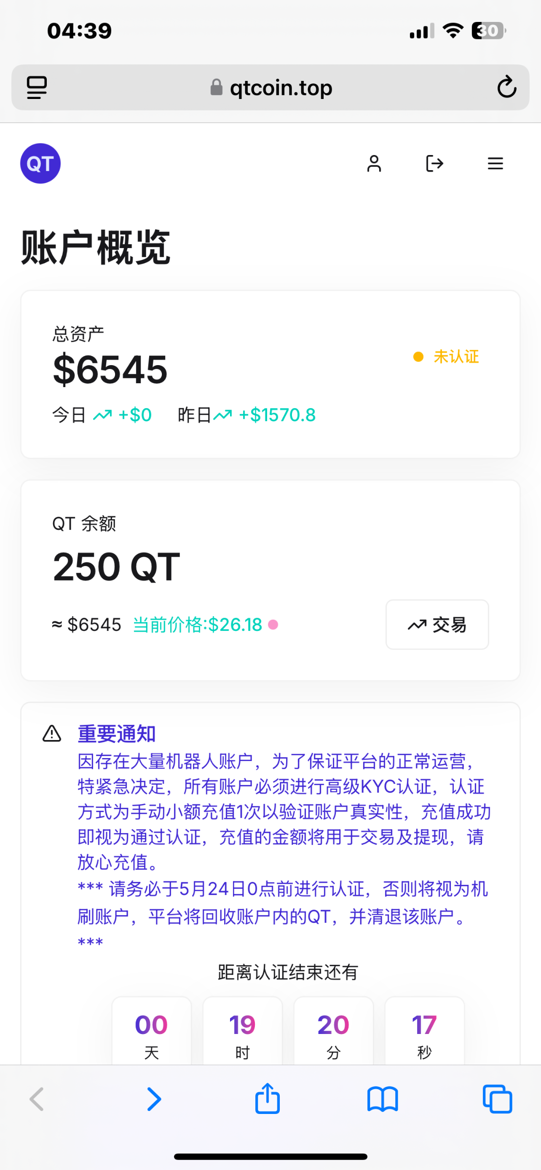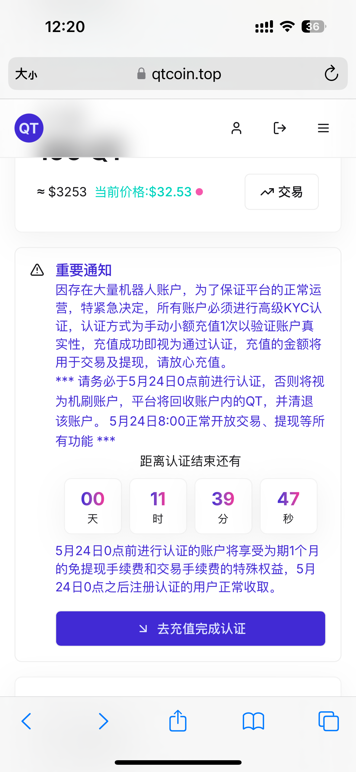 ***  请务必于5月24日0点前进行认证,否则将视为机刷账户,平台将回收账户内的QT,并清退该账户。  5月24日8:00正常开放交易、提现等所有功能  ***          最低充值10u,傻逼平台以为这样能骗到钱?