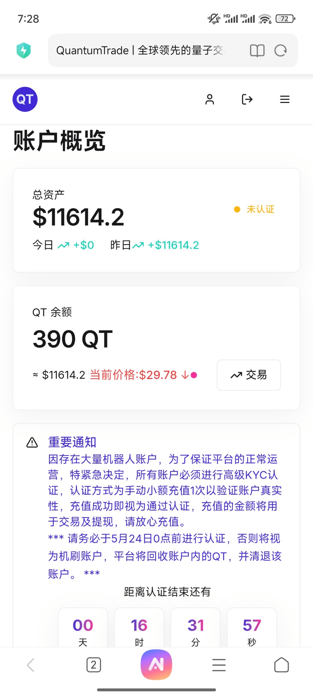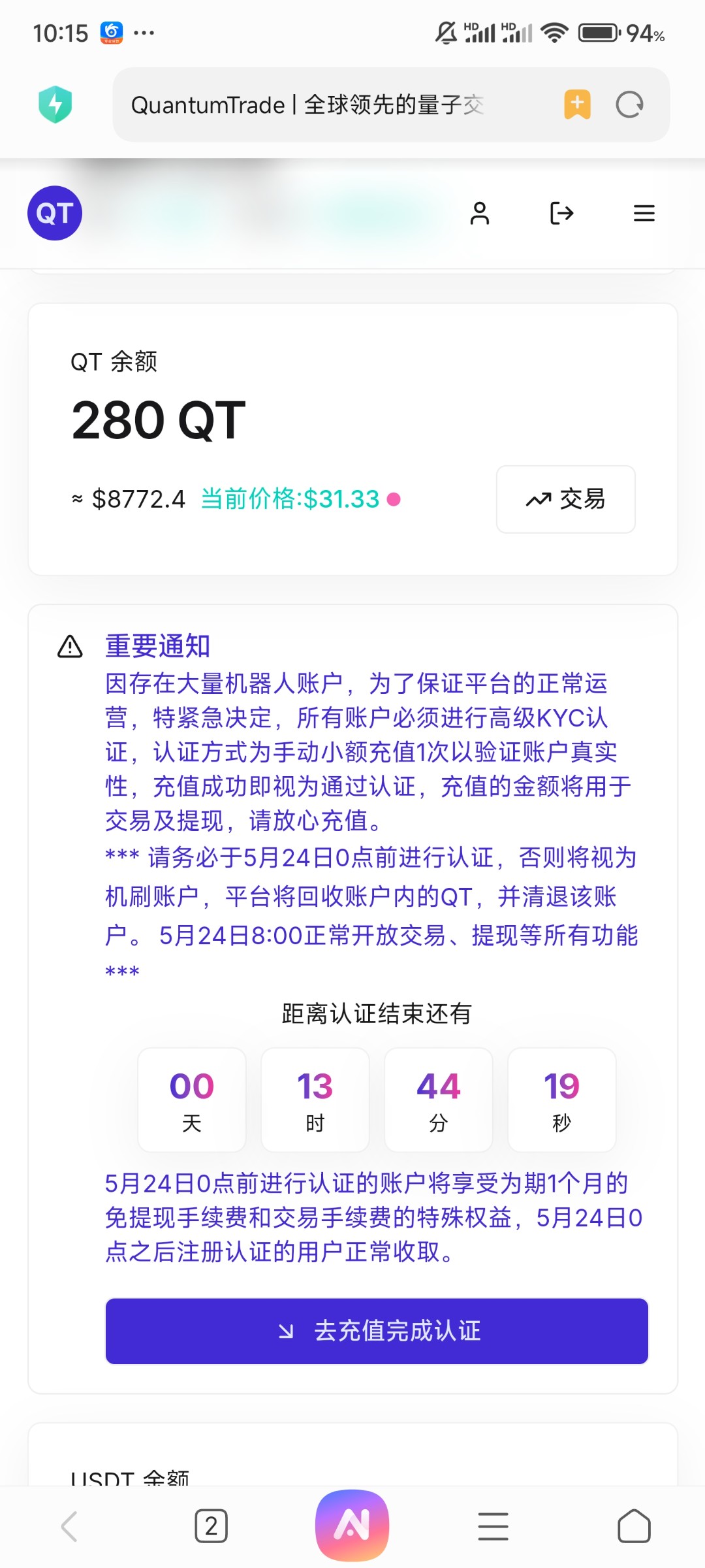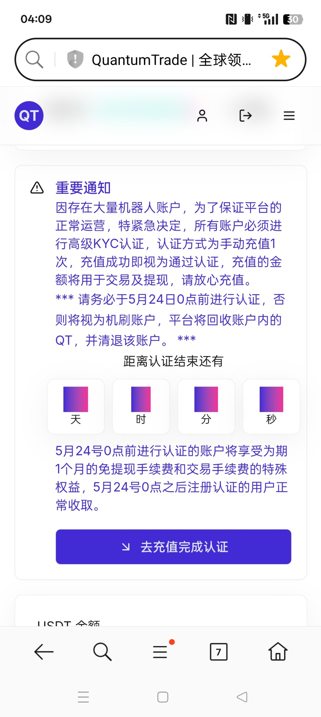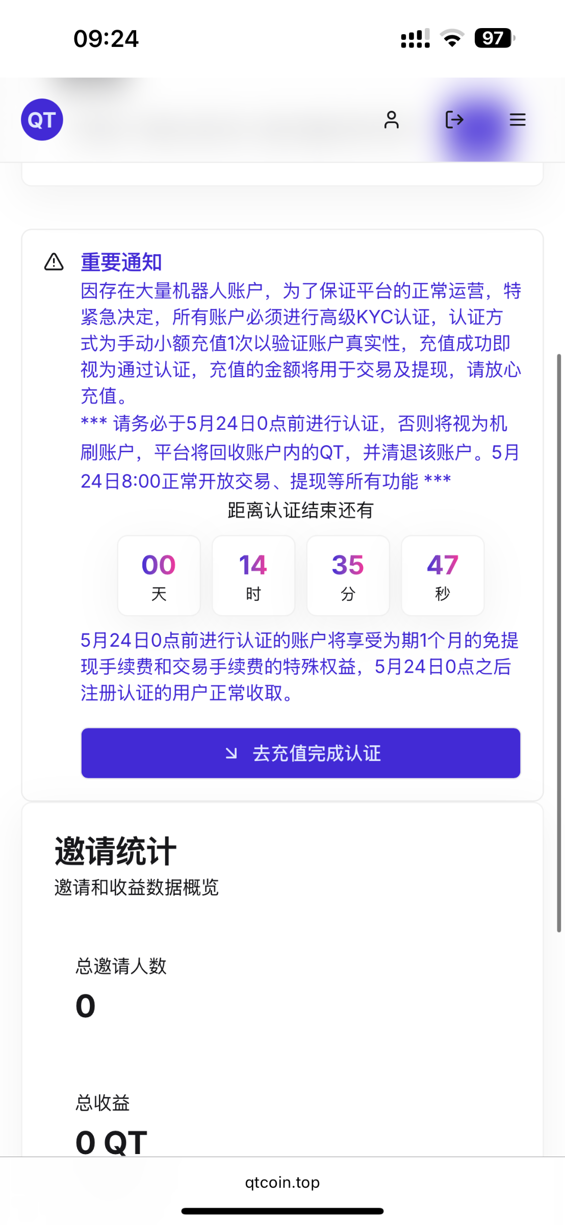 ***  请务必于5月24日0点前进行认证,否则将视为机刷账户,平台将回收账户内的QT,并清退该账户。  5月24日8:00正常开放交易、提现等所有功能  ***          最低充值10u,傻逼平台以为这样能骗到钱?