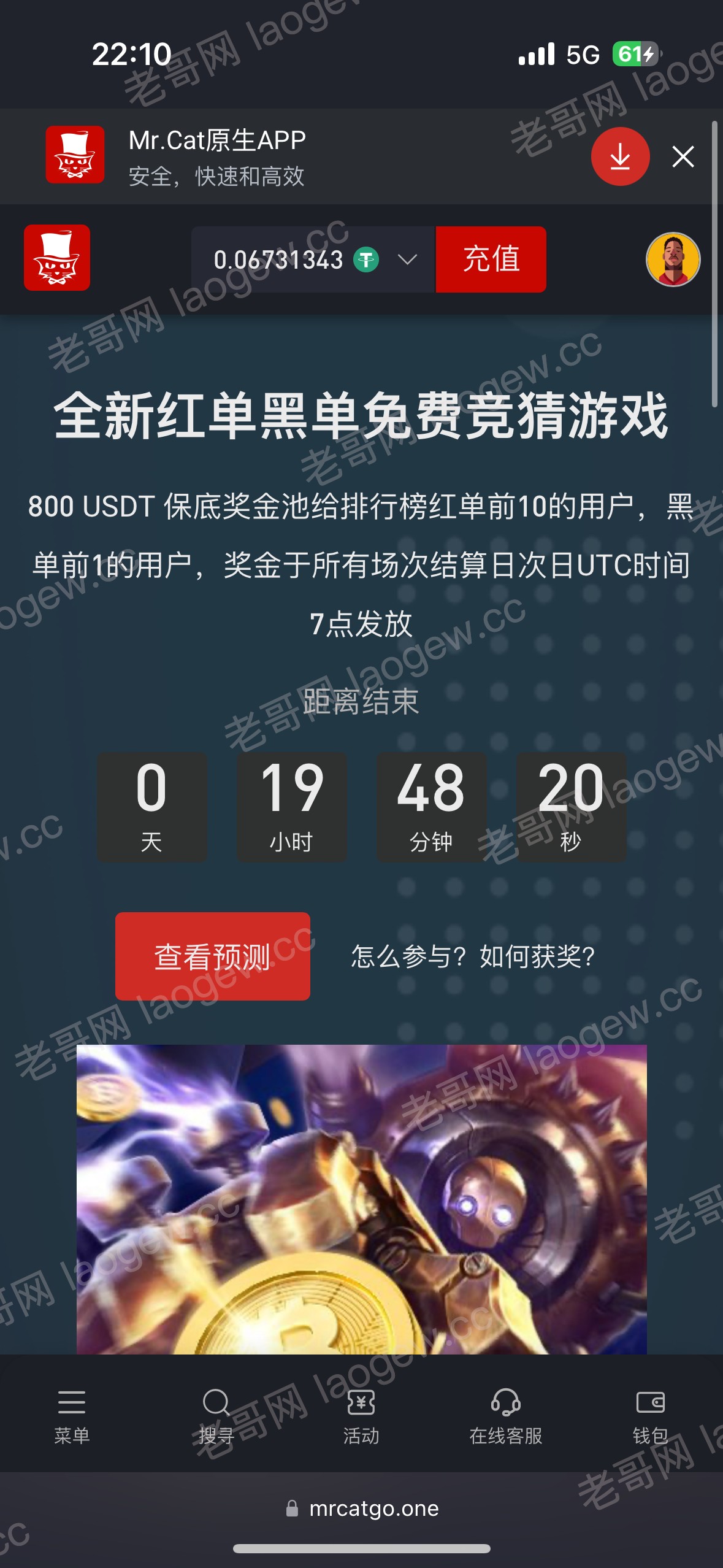 上次论坛发的猫先生免费竞猜奖励发了,我给了我0.5u,麻1打到7u,剩5u去真人挂了