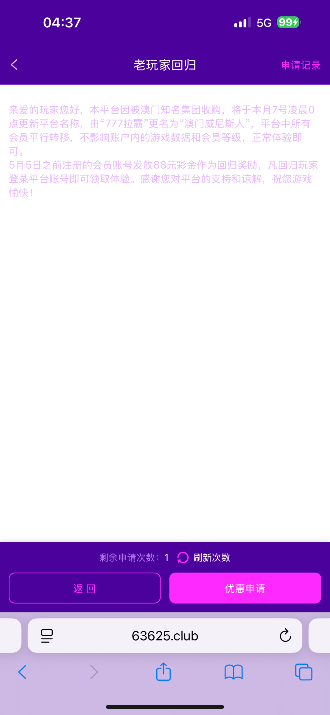 老板您好, 回归彩金领取在优惠页面的活动中-一键申请即可!会有专员审核发放。1、5月5日之前注册的账号且充值记录最低100元,即可发放88彩金,2、88彩金需完成10倍流水即可提现。祝您游戏愉快~你要充值,你是一下都不讲