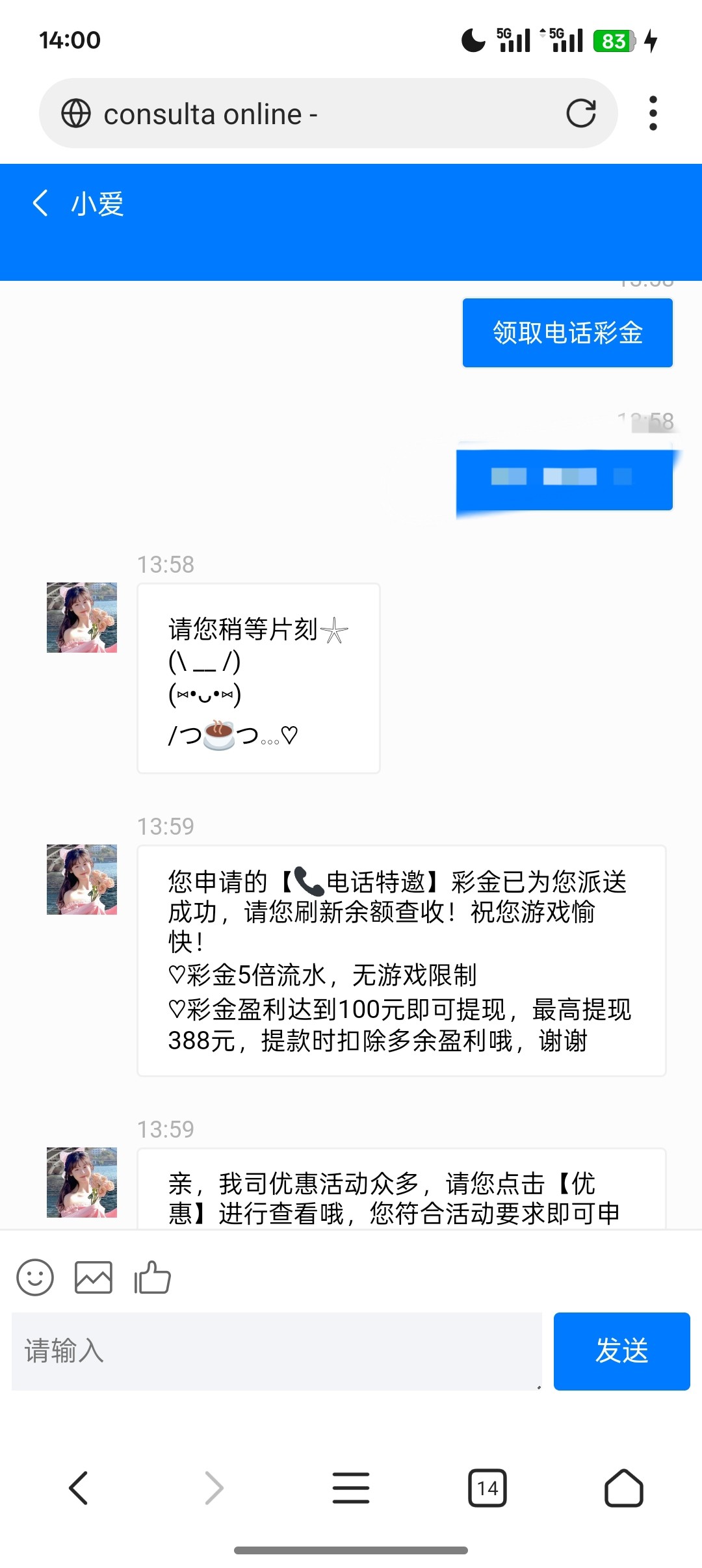 澳门永利3339刚打电话 联系客服申请电话彩金 网址3339.com 领到了18还没打 不方便接电话的老哥们可以去碰瓷试试