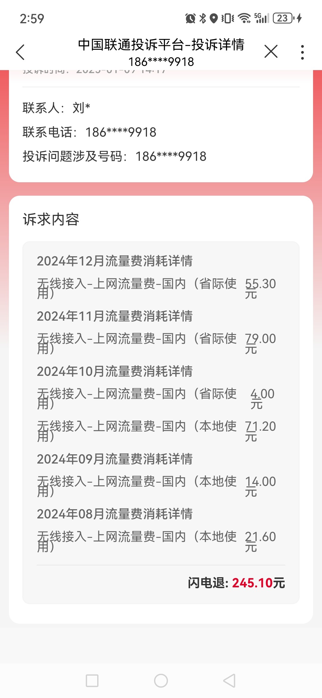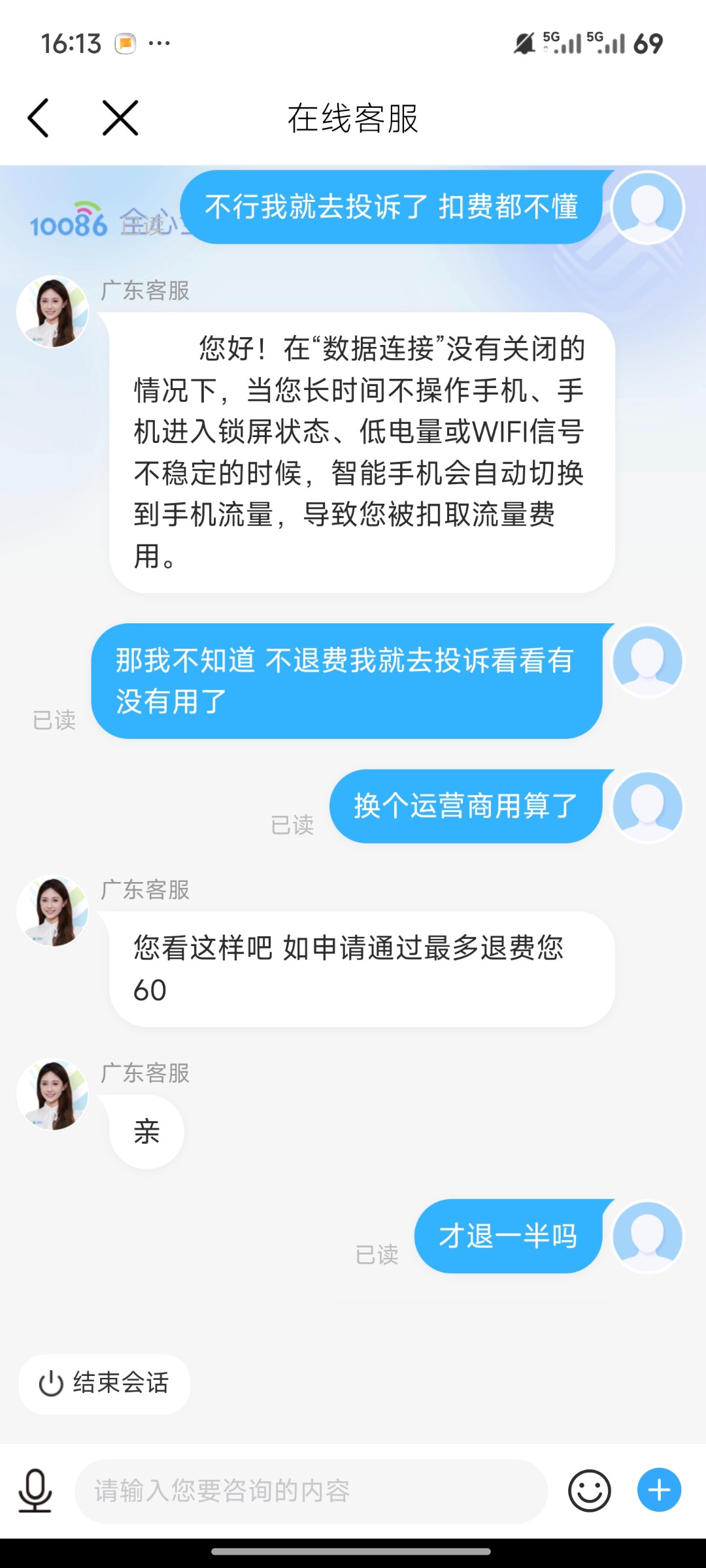 我艹,血亏啊我那个联通的手机号之前每个月上网费超出2.3百七年了,最近半年换了个电信号在用,刚刚上联通APP看到那个联通号近半年每个月也还是超出5.6十,点投诉申请退费秒退了半年的300