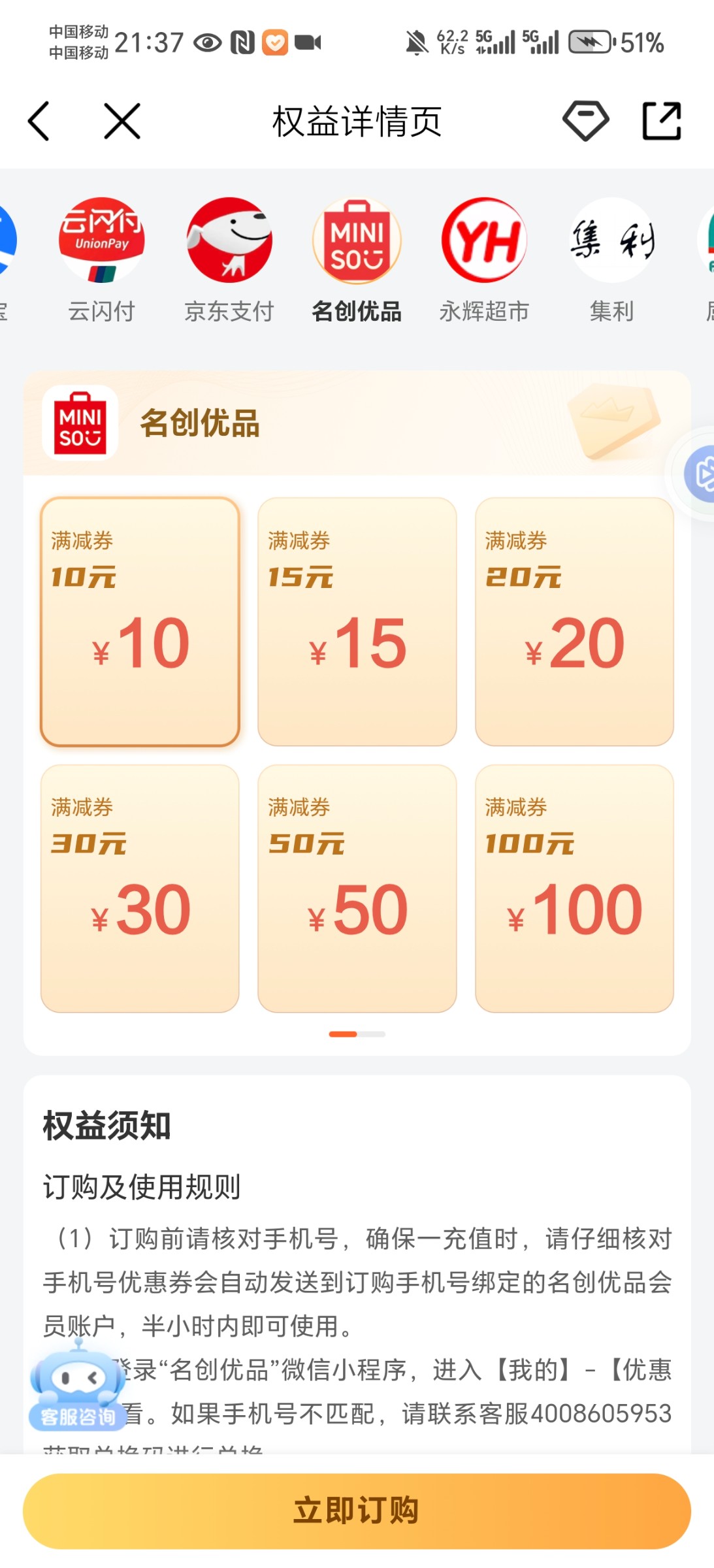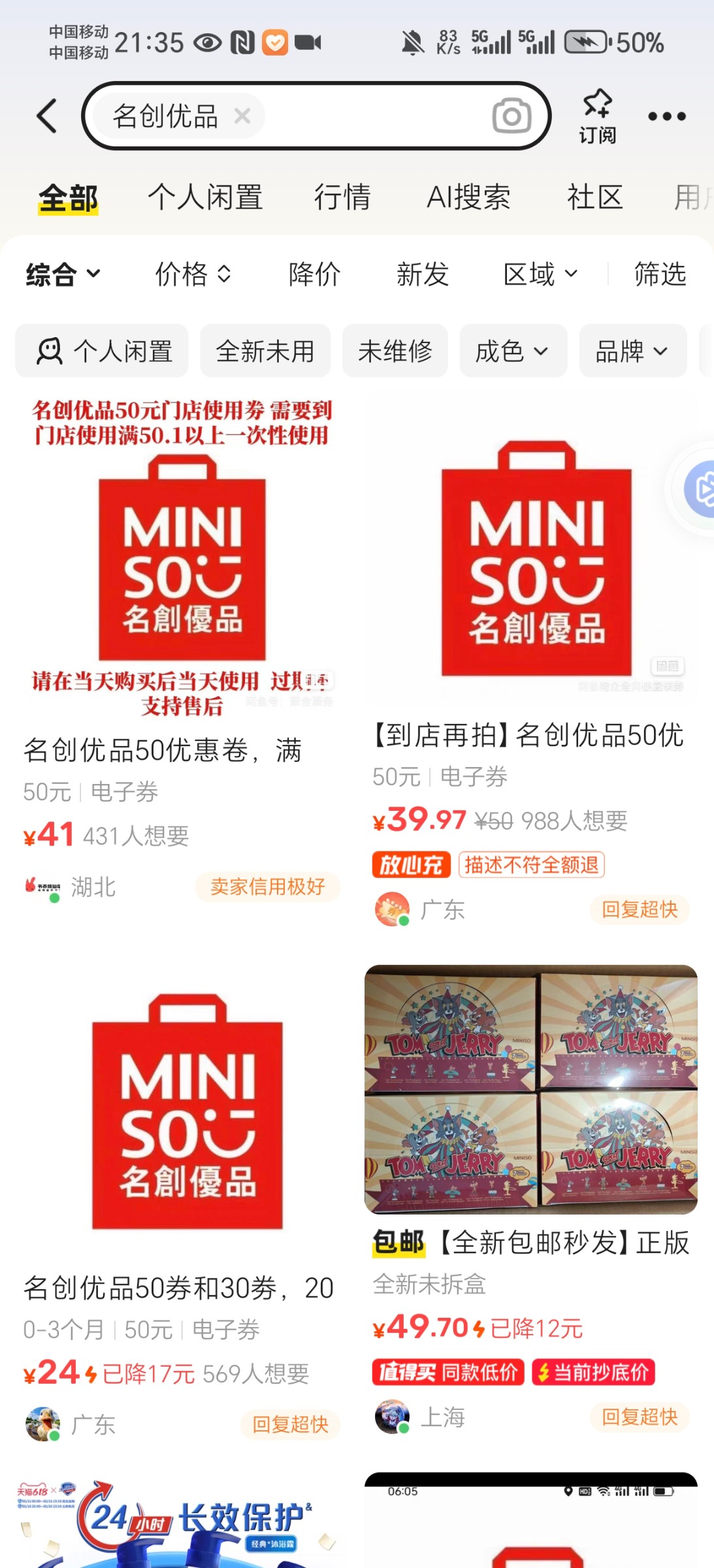 用移动卡的老哥没钱吃饭了可以去昨天老哥那里学着退费 然后去中国移动APP搜索名创优品然后买卷可以去闲鱼8~85折出了折现,有需要的老哥去吧都是秒卖的,记得卖的时候写只能线下支付