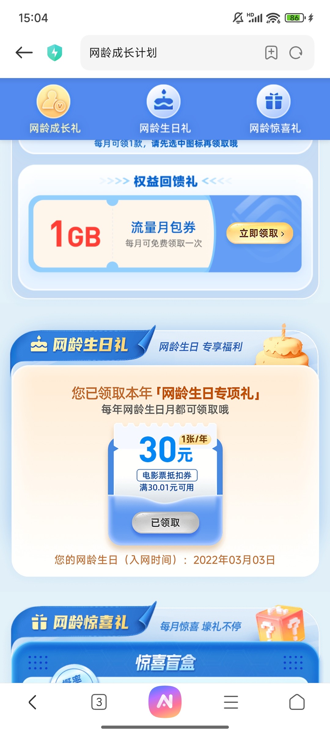看网龄,我领到了一张30-30的,可以挂闲鱼出了,没有请无视