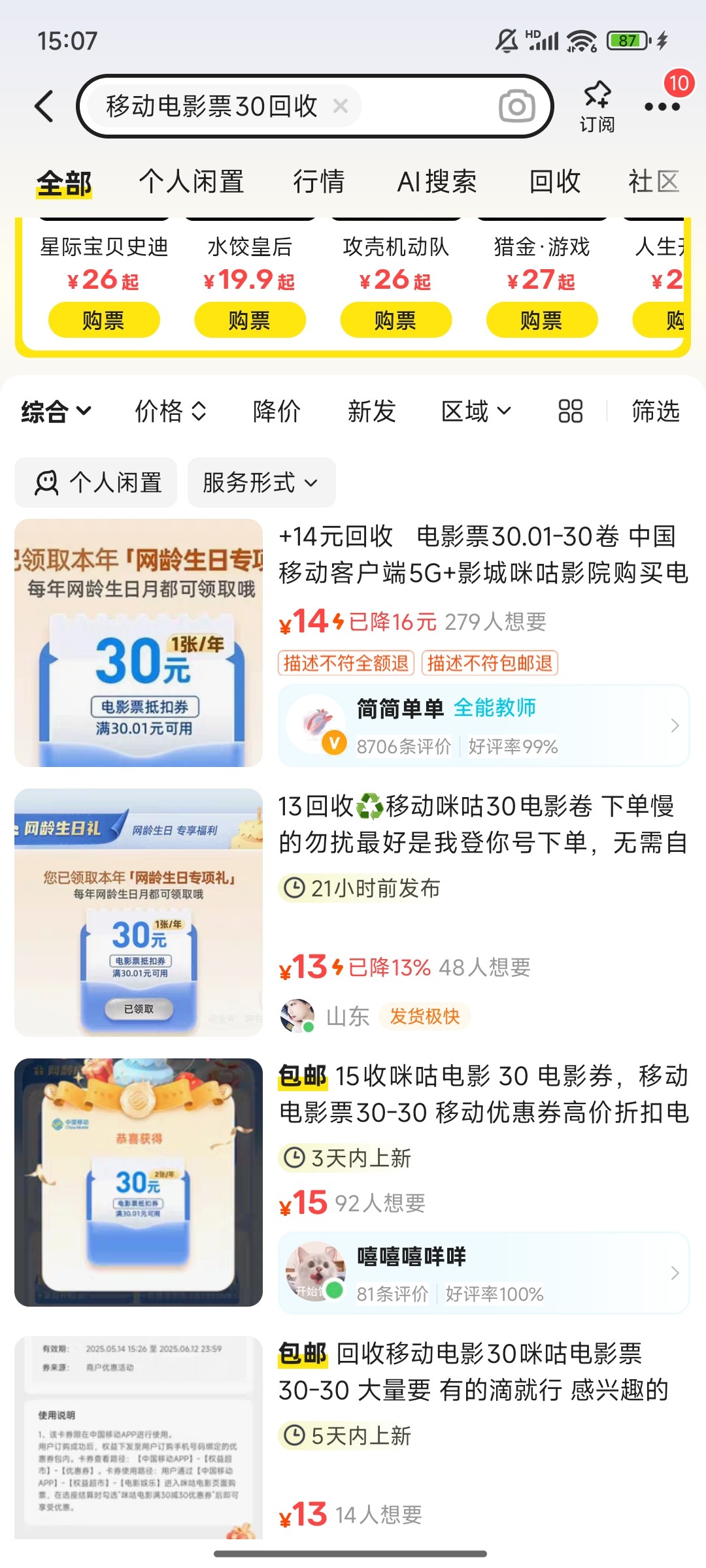 闲鱼搜索移动电影票30回收即可,13-15大项目