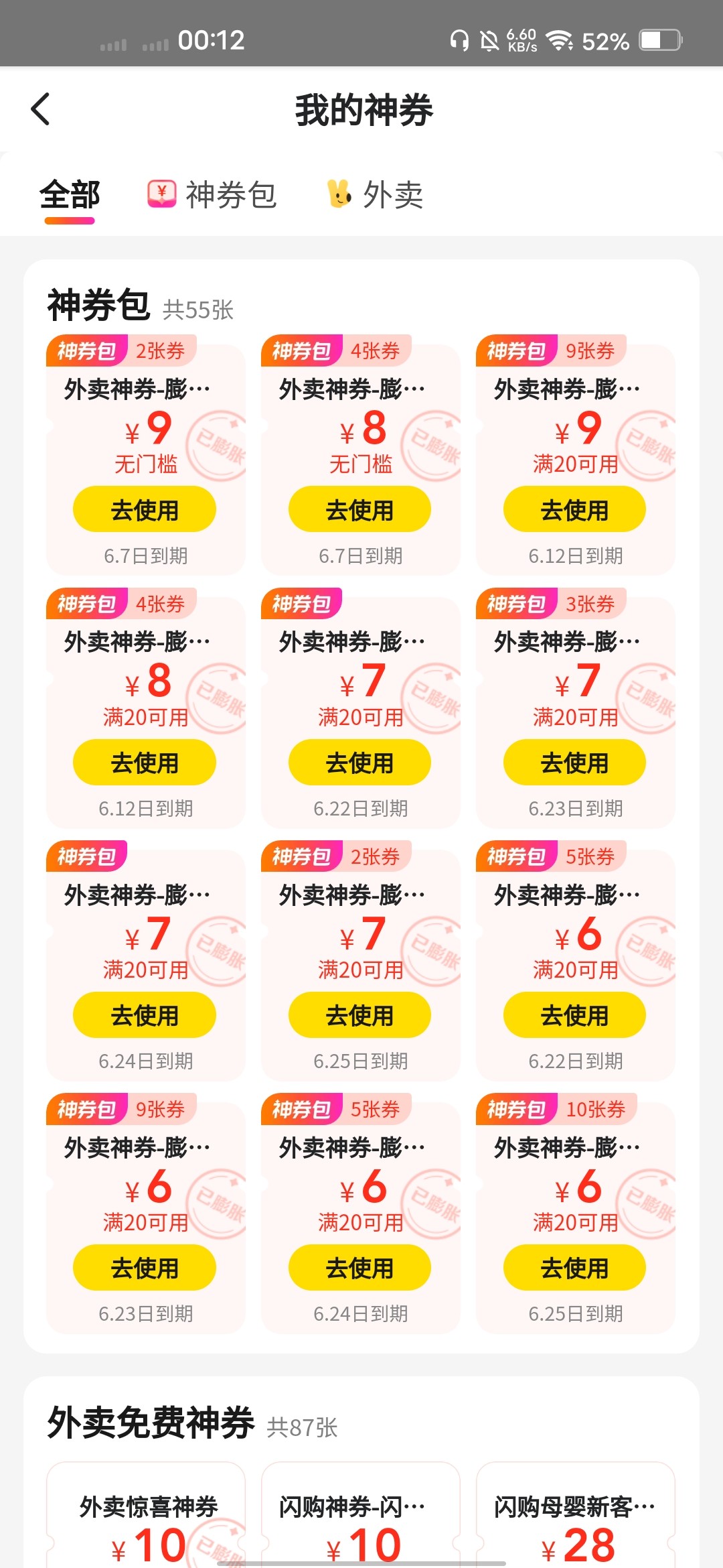 减7减6的都干三十多张了,尼玛的傻逼美团杀熟,膨胀了个寂寞,搞那个18-18的,一天一次,用了一下普通的结果不能在用无门槛的膨胀了,妈的草率了,今天就最多减了个十块,没18-18了