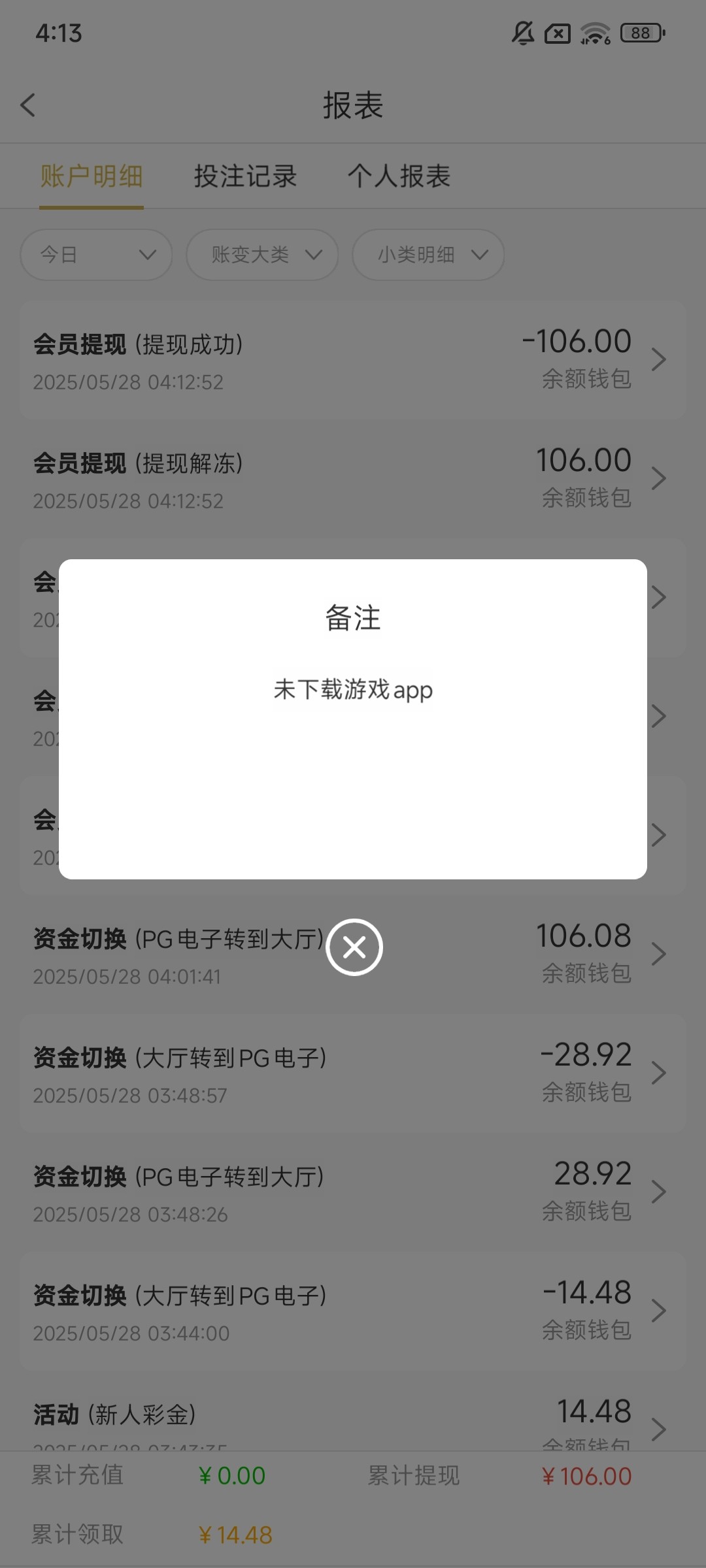 心累了 打到2000多提不出来 因为我已经注册过了 这次注册填的是我朋友的实名 他那边地区反诈太严重了,下载电子钱包全被拦截了 全都下载不了 搞得我没耐心了,全输完了 煮熟的鸭子飞了 中途还充了80块钱进去