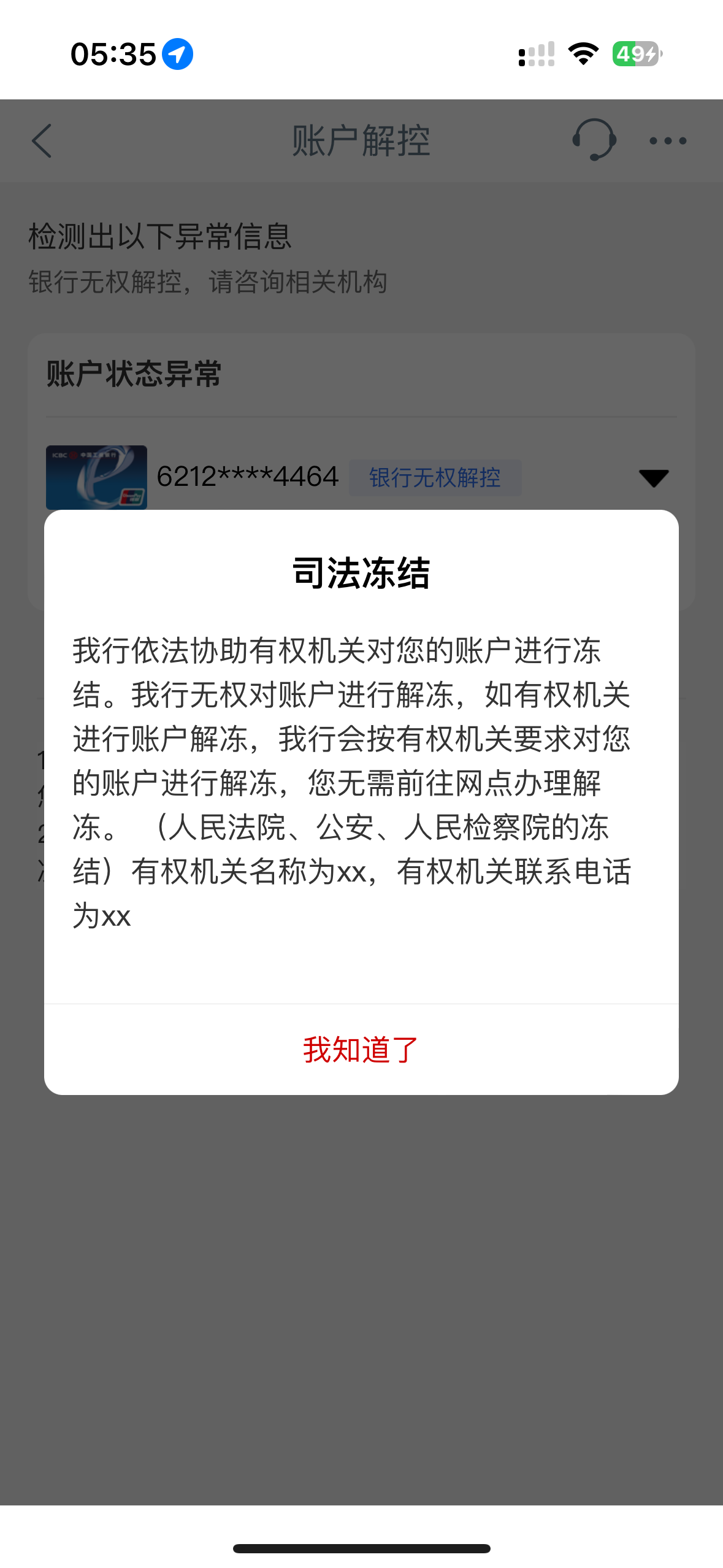 我的也冻结了。就工商被司法冻结。过了几个月卡里被扣了6000多块钱。快一年了也没有解开