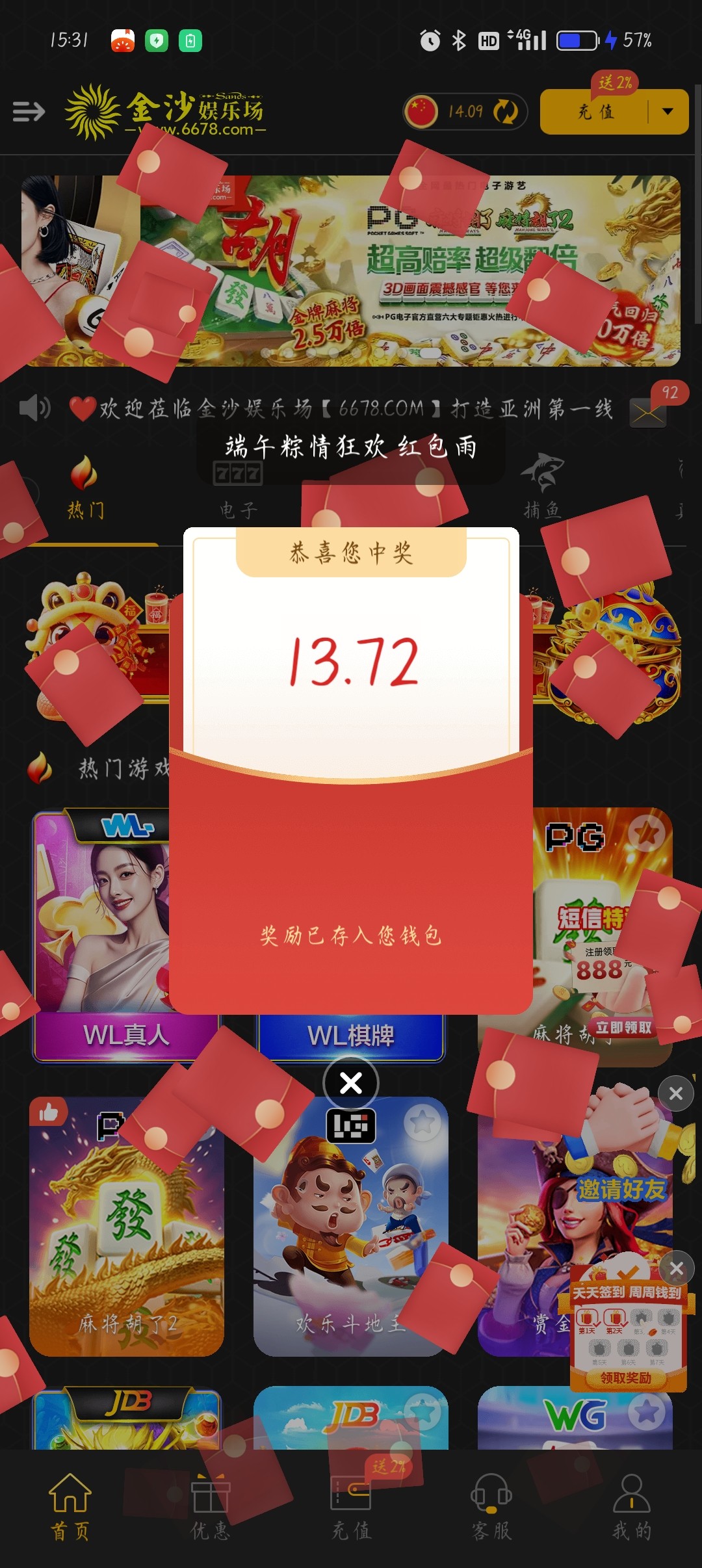 我充值1万多了红包每次几十块。。