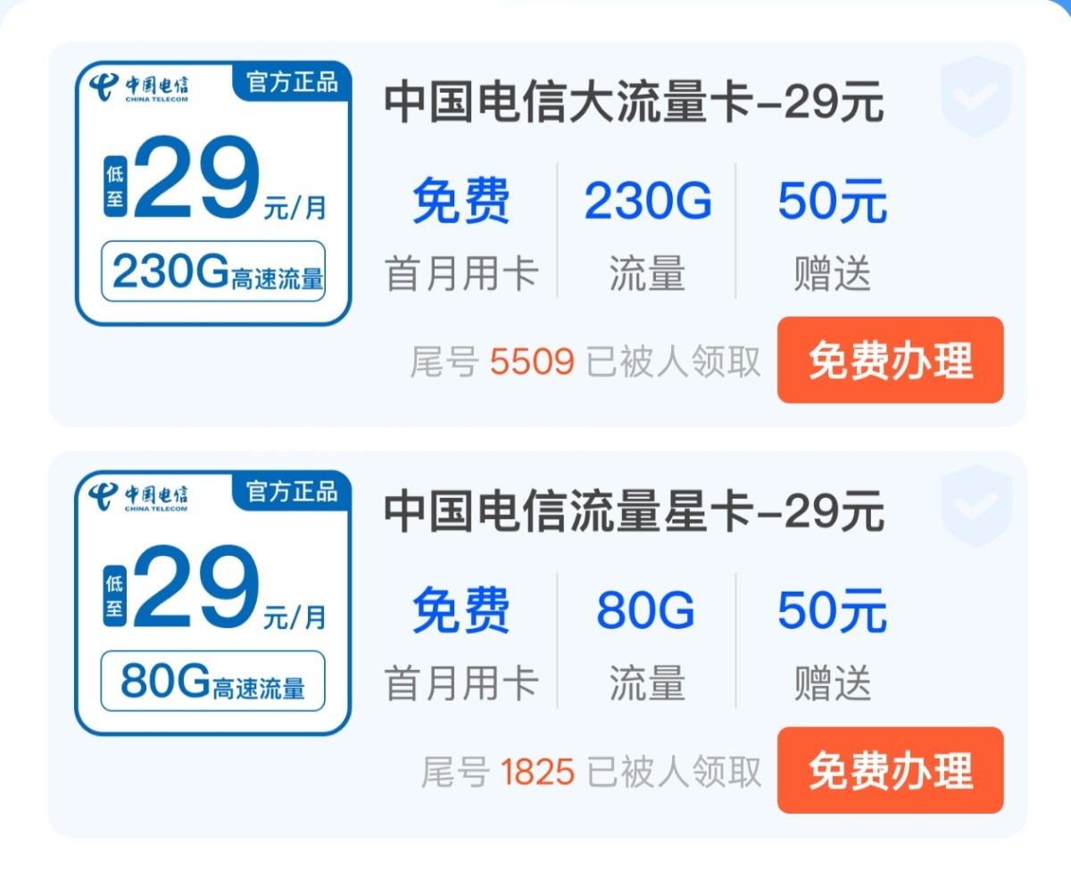 这个是电信29元185g100分钟长期,首月免费。https://172.lot-ml.com/h5orderEn/index?pudID=e329041044d61f5e&userid=ba3b537fe5af38df办流量卡一定要看好优惠期,有的卡几个月就恢复原价了,或者一两年就没流量包了,更坑的还有合约,提前注销还得交违约金