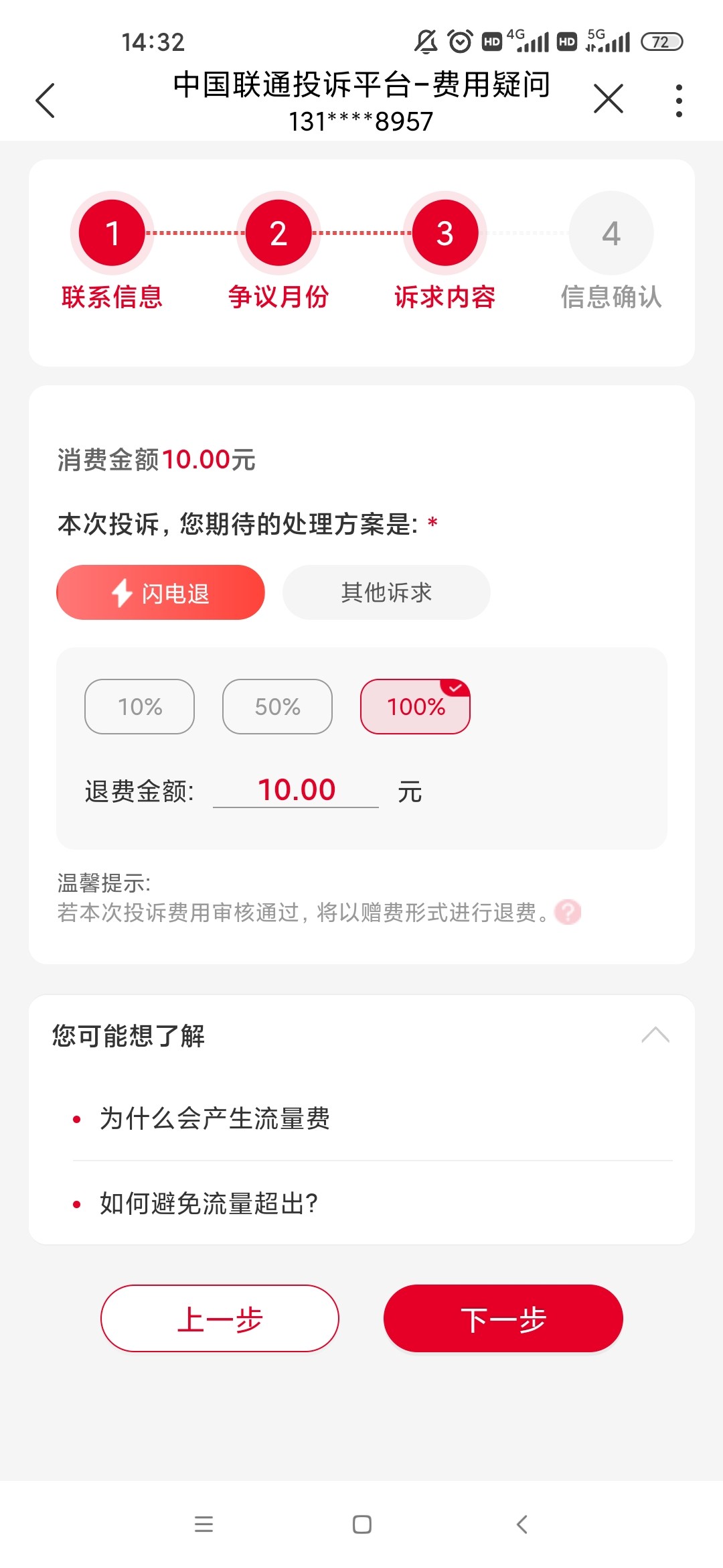 联通电信退超流量费的,半年内的。去联通app找在线客服,发送投诉,选择费用疑问-然后选择第一个流量,会提示能退多少选择百分之100 闪电退