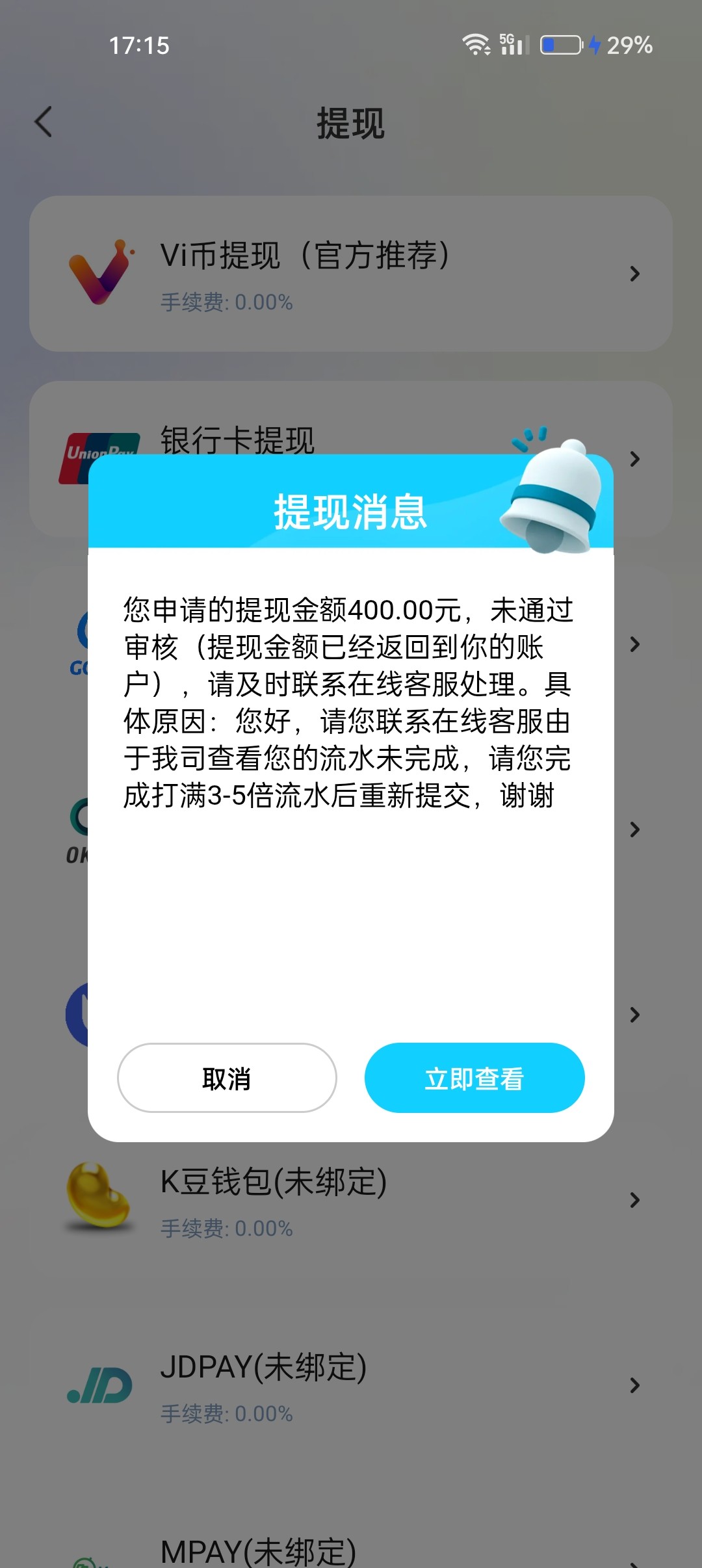 p了好几天了终于出了一个,一开始说我p图,后面录视频就给了,提现显示流水要3-5倍,以为没戏了,后面打了一点流水用他们里面的钱包提现就到了