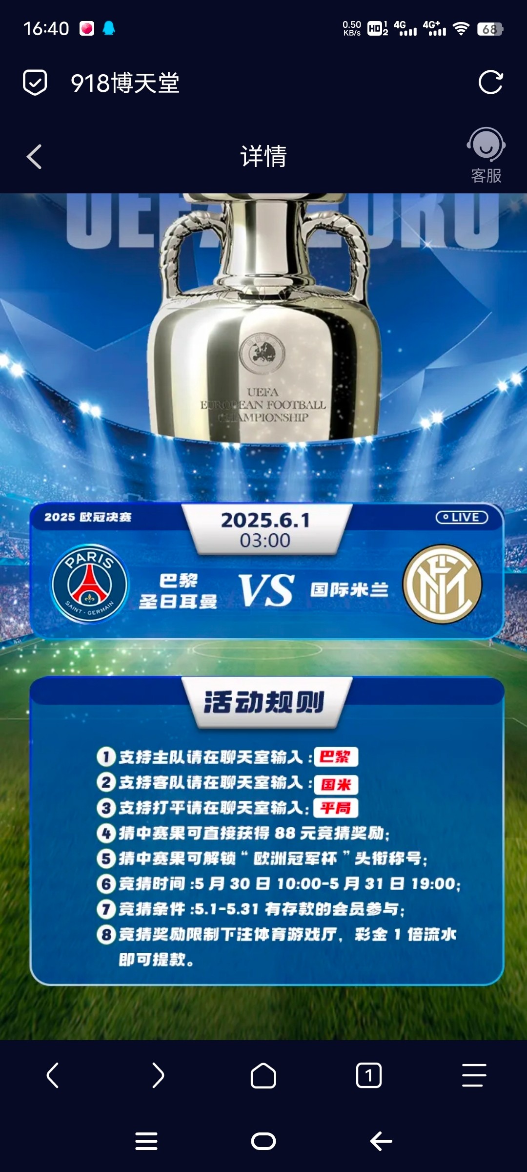 918博天堂欧冠竞猜88 5.1-5.31存过的才行 5.14有个老哥发过一次竞猜了 如果当时充了钱这次也符合 中了就是88彩金 918存过的老哥别漏参加 官网918.com