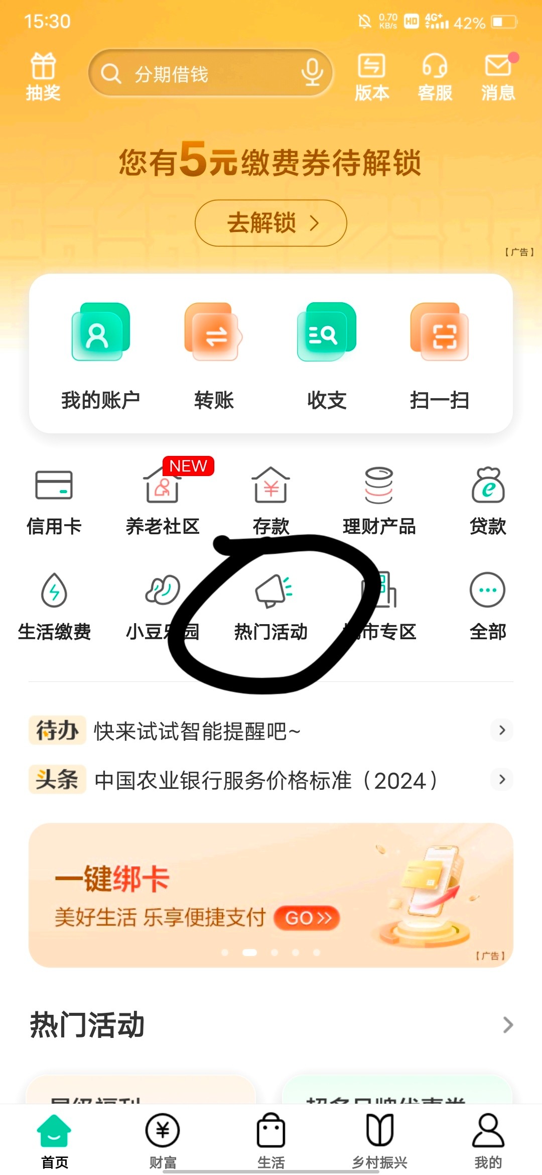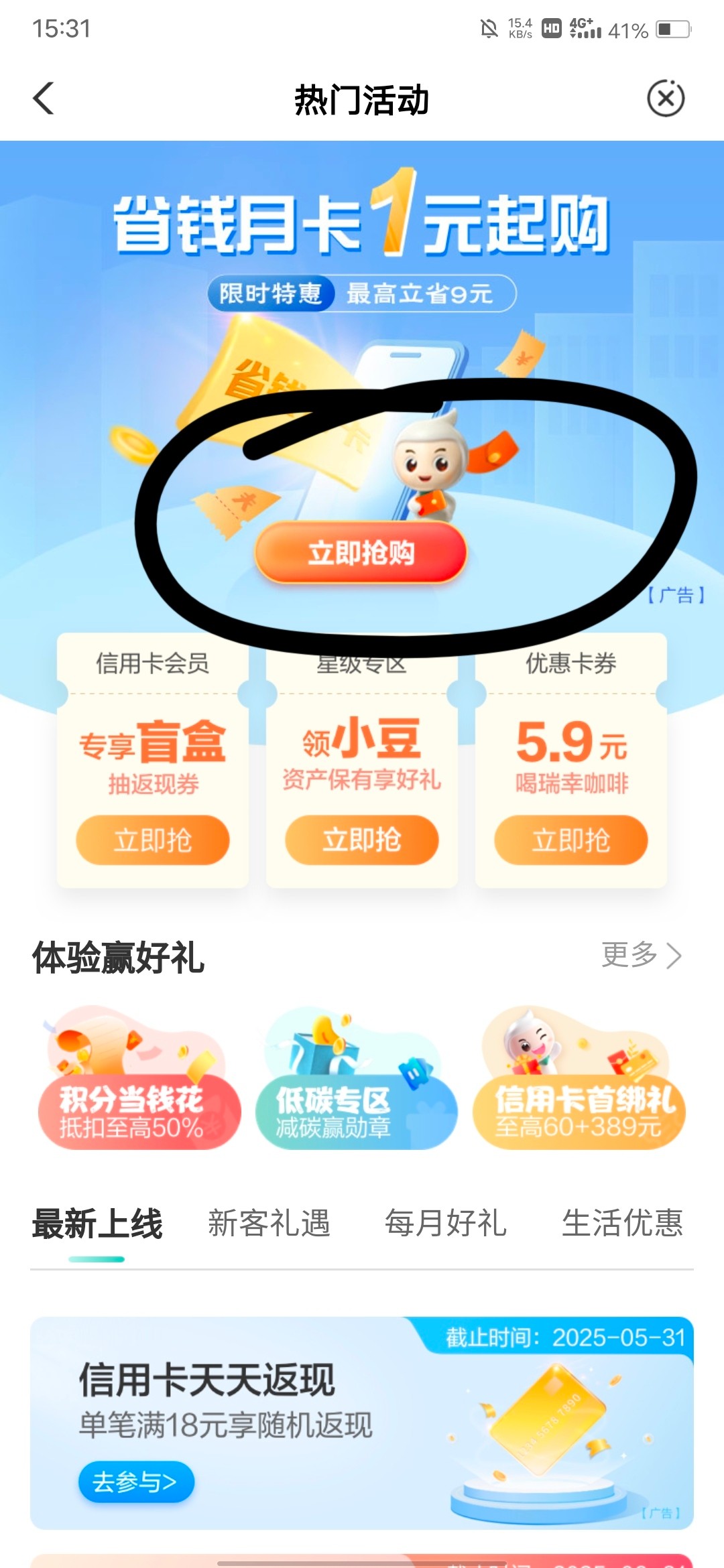 农业银行首页热门活动又可以1块钱买10元立减金了,都是1~3元买10元立减金