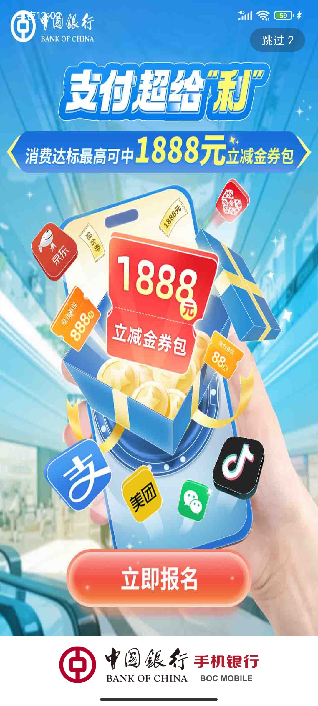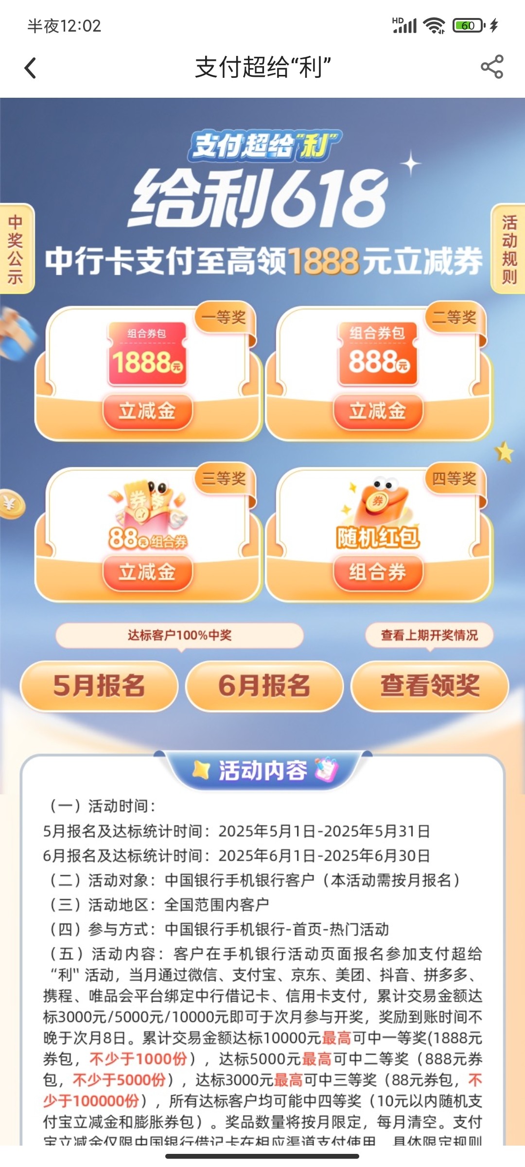 中行支付超给“利”马上可以报名六月份活动了,交易流水三千以上即可参与,四月份我中了个二等奖888,五月份的过几天开奖,交易流水达标百分百中奖的