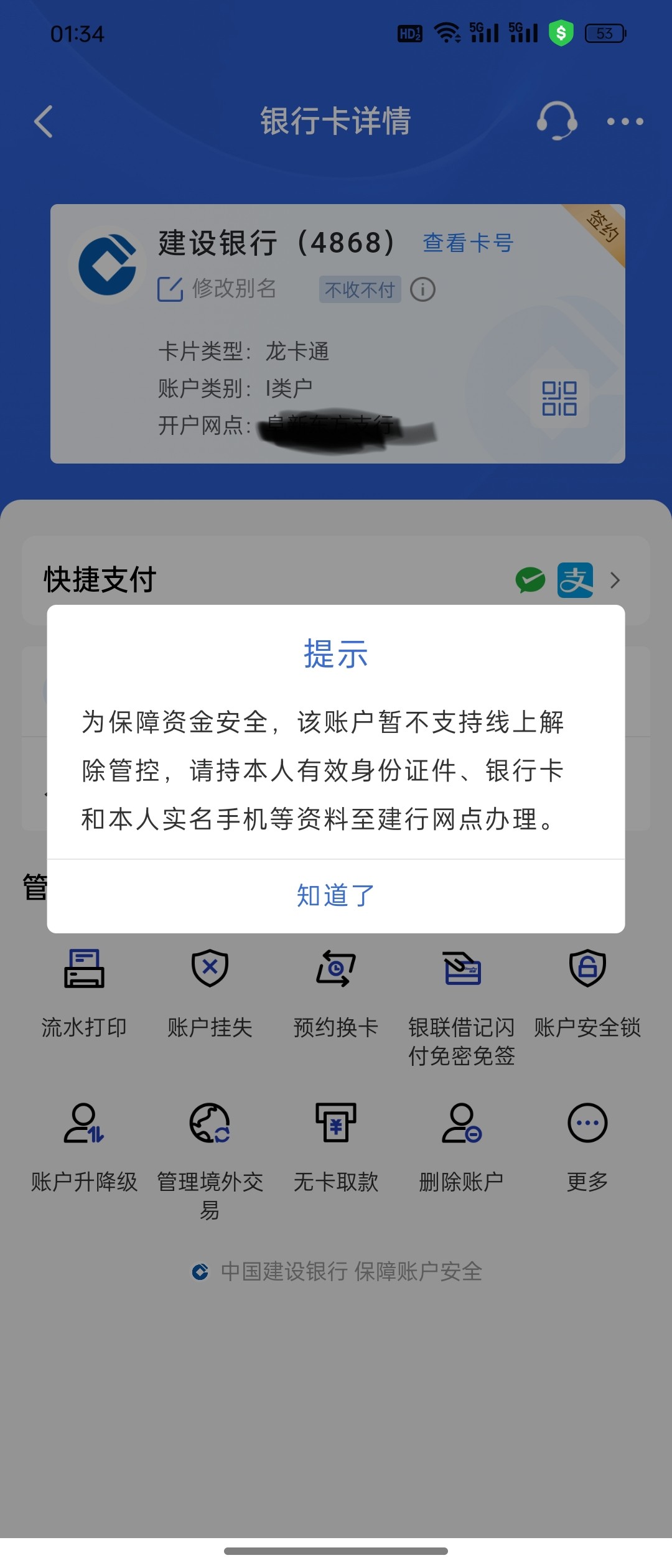 老哥们23年玩野鸡台提现都是走的卡 当时没冻结 一个月后冻结的 不收不付 但是除了建行卡别的卡都正常用 今天我去建行想消掉 柜台人员说是我开户的那个银行冻结的 我怕我去找了以后对我别的卡有影响 这个一直放着不管没事吧 已经两年了都没啥事