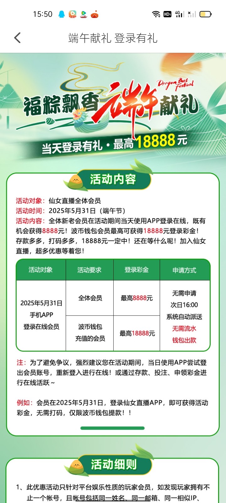 仙女直播端午节登录彩金,5月31日登录app,6月1日下午4点开始派送。网址1155.tv