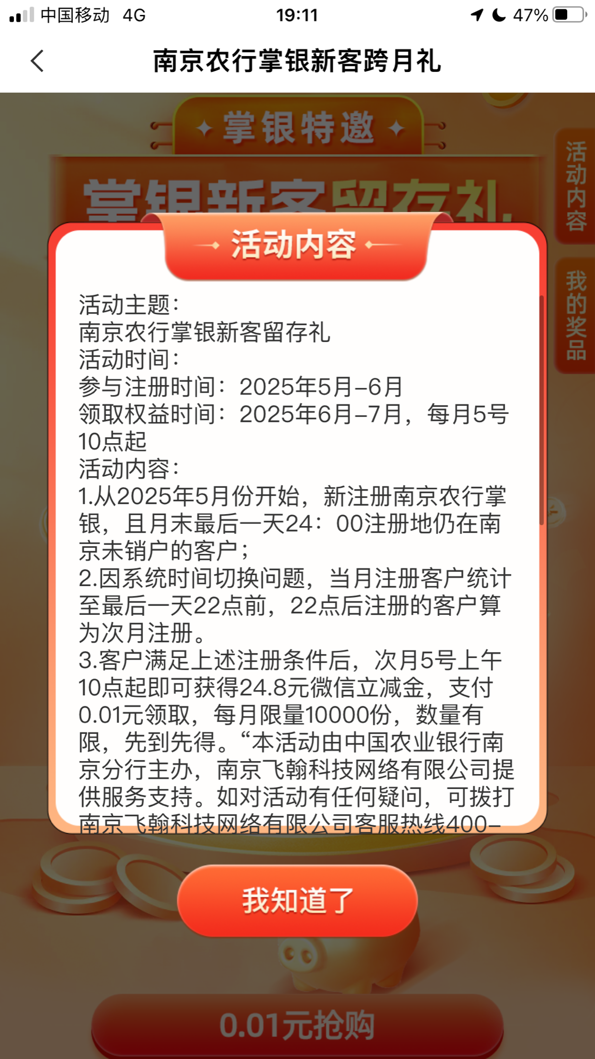 农行每月一次的白嫖,不知道怎么注销重新注册特定地区(飞)的自行百度。泰州以前都是25立减金,下个月好像变成8了,别去。